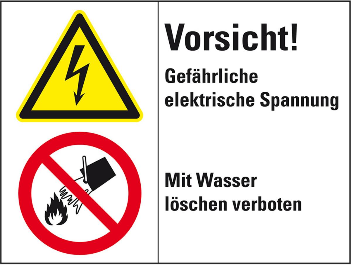 Mit dem Kombischild "Vorsicht! - Gefährliche elektrische Spannung" und "Mit Wasser löschen verboten" weisen Sie in Text und Bild auf Gefahren und Verhaltensmaßregeln hin. Durch die Kombination aus Piktogramm und Text ist das Schild besonders gut verständlich.