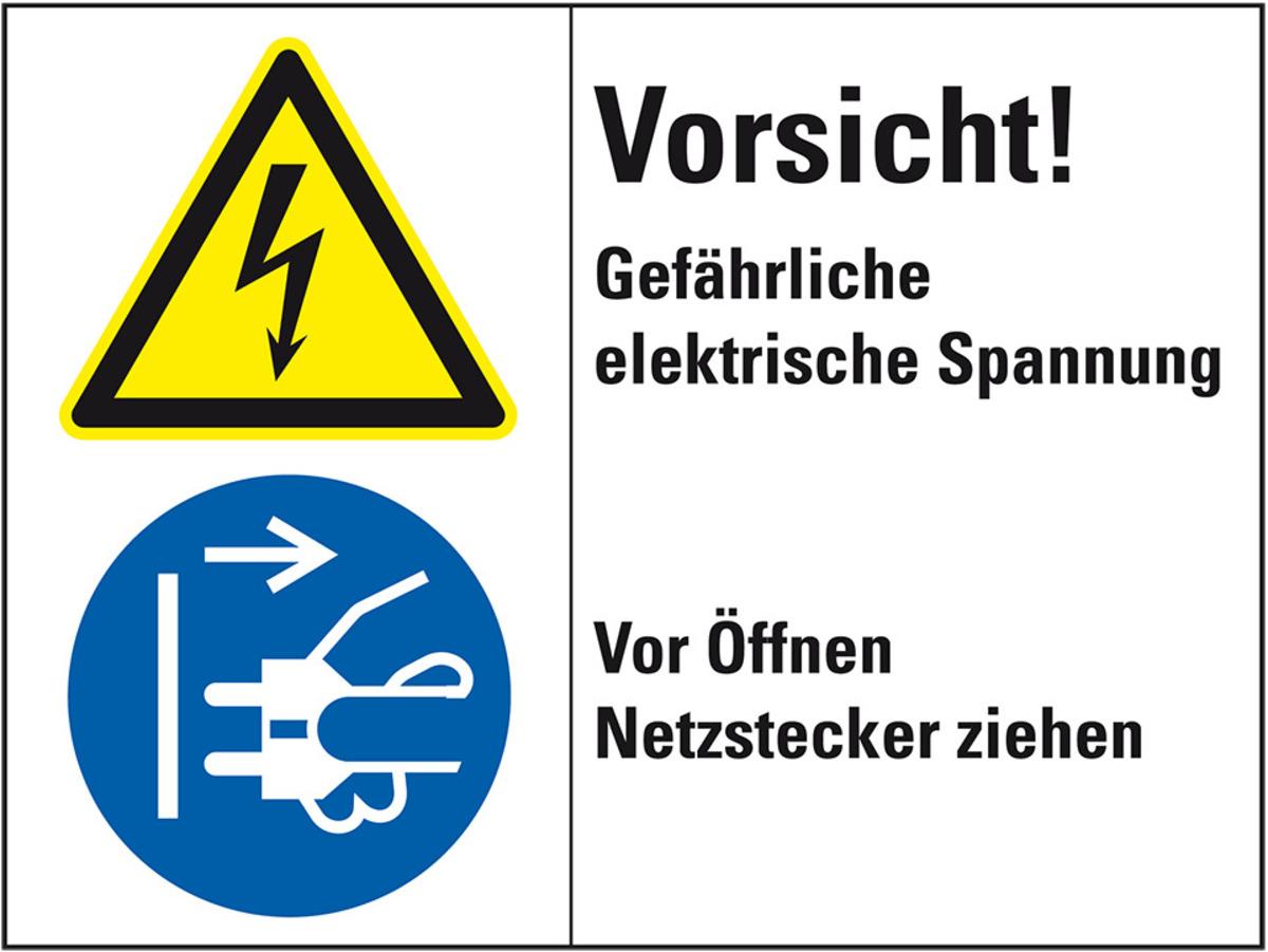 Mit dem Kombischild "Vorsicht! - Gefährliche elektrische Spannung" und "Vor Öffnen Netzstecker ziehen" weisen Sie in Text und Bild auf Gefahren und Verhaltensmaßregeln hin. Durch die Kombination aus Piktogramm und Text ist das Schild besonders gut verständlich.