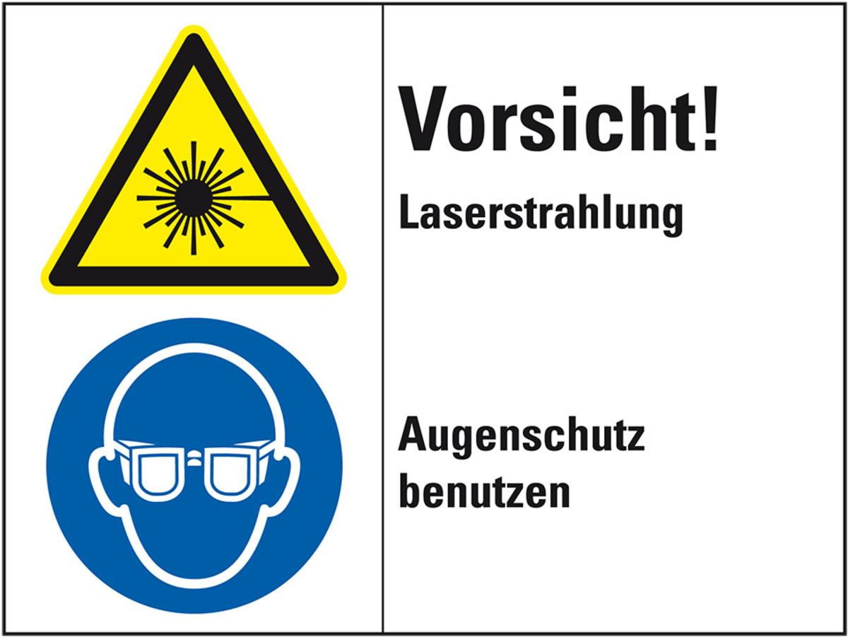 Mit dem Kombischild "Vorsicht! - Laserstrahlung" und "Augenschutz benutzen" weisen Sie in Text und Bild auf Gefahren und Verhaltensmaßregeln hin. Durch die Kombination aus Piktogramm und Text ist das Schild besonders gut verständlich.