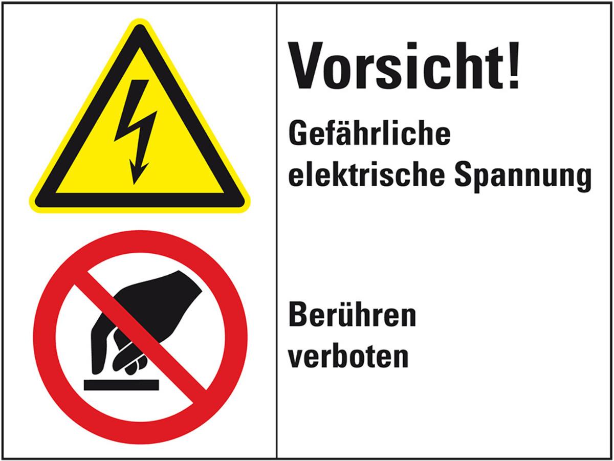 Mit dem Kombischild "Vorsicht! - Gefährliche elektrische Spannung" und "Berühren verboten" weisen Sie in Text und Bild auf Gefahren und Verhaltensmaßregeln hin. Durch die Kombination aus Piktogramm und Text ist das Schild besonders gut verständlich.