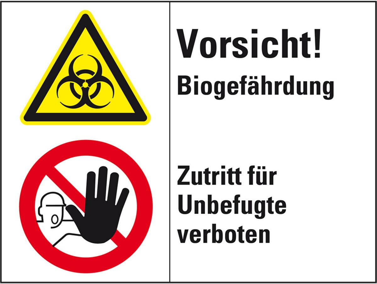 Kombischild mit den Texten/Symbolen "Vorsicht! Biogefährdung" und "Zutritt für Unbefugte verboten"