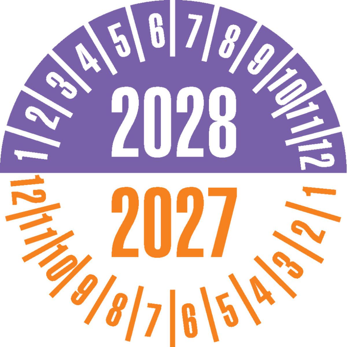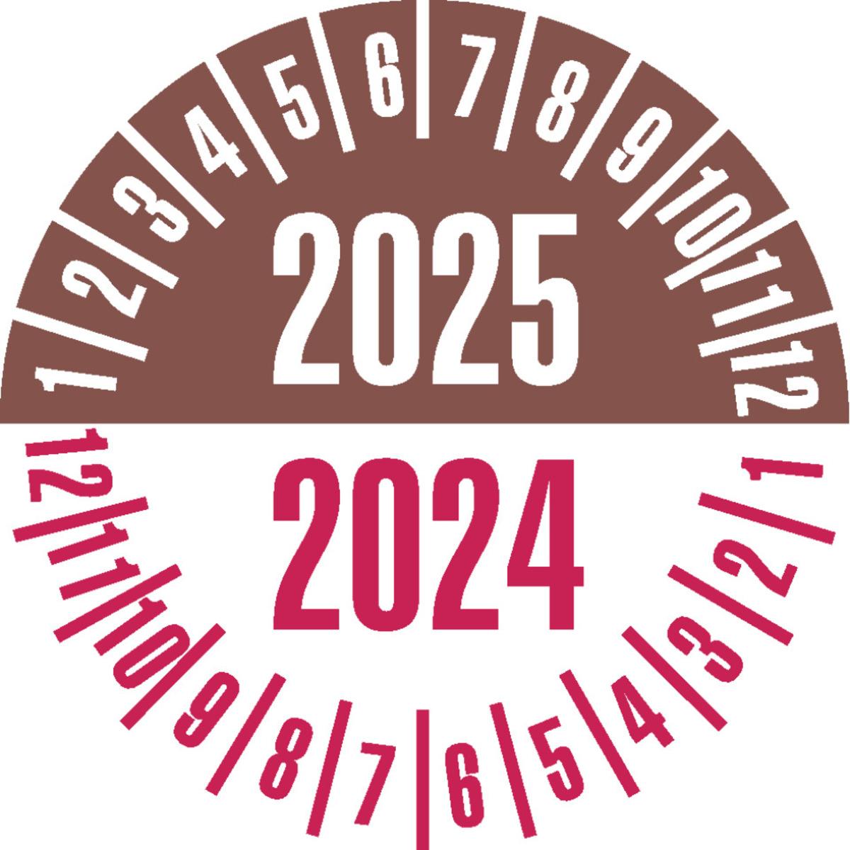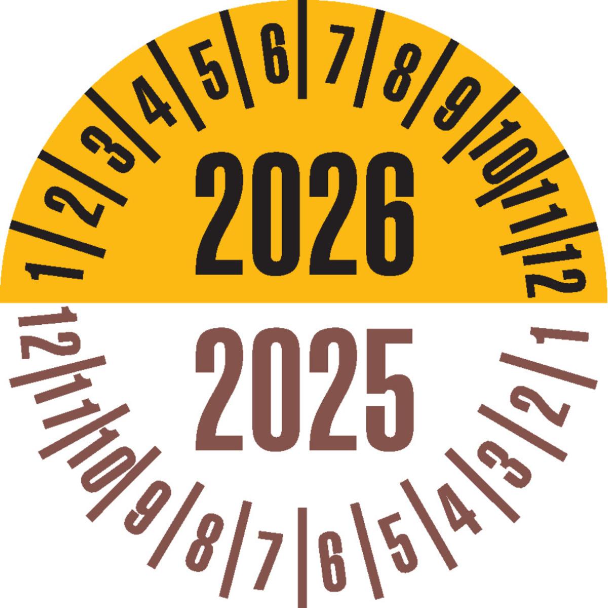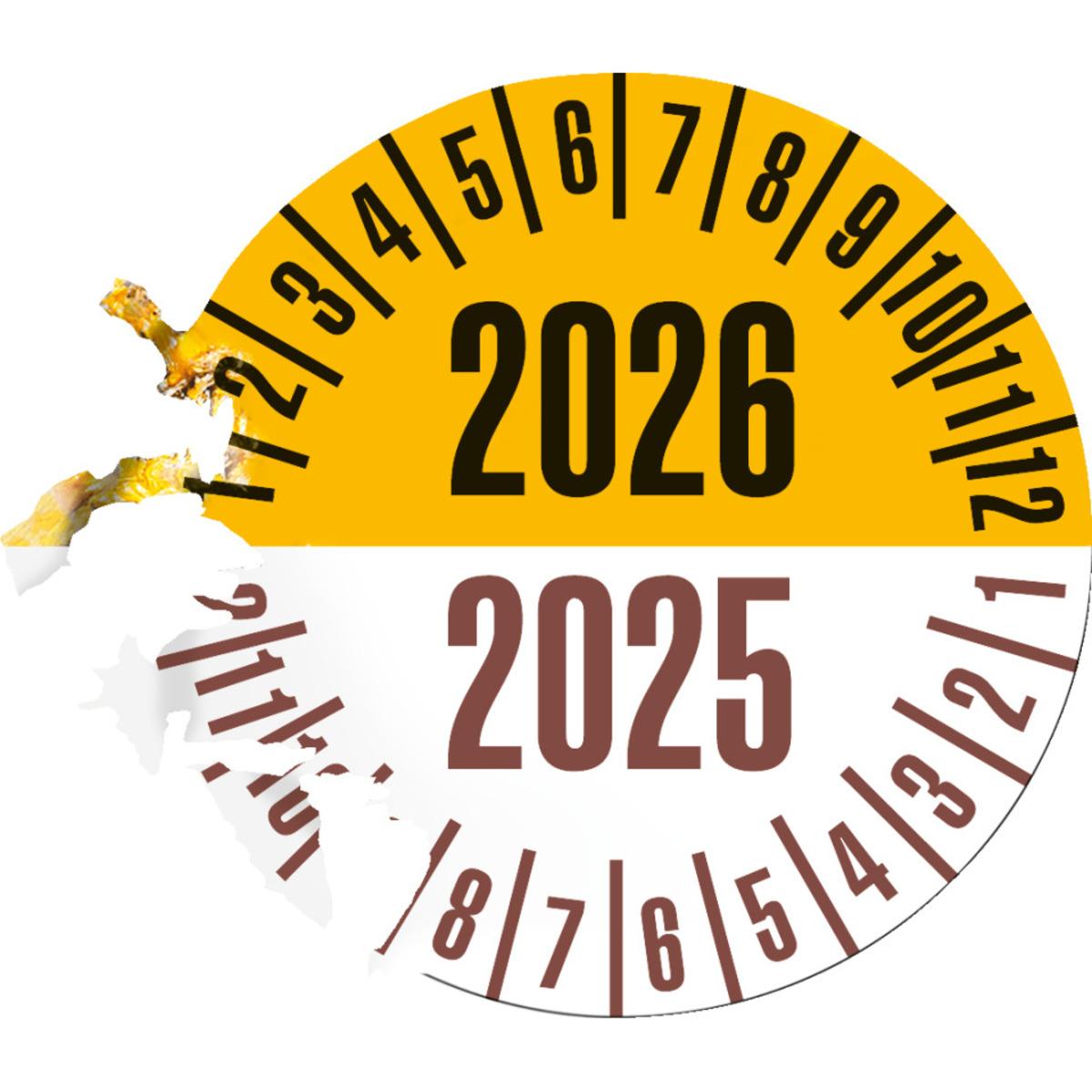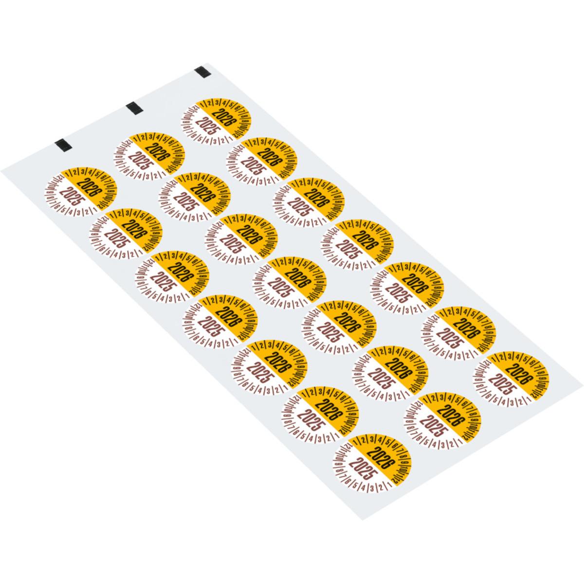 Auswahl: Prüfplakette 2026/2025, gelb/braun, Dokumentenfolie, Ø 25mm, 21/Bogen