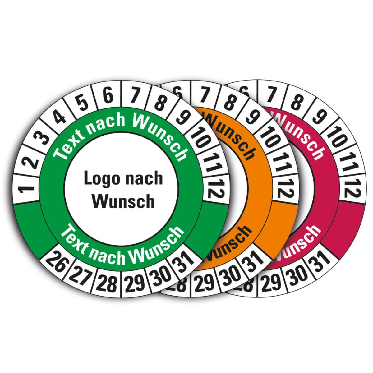 Individualisierbare Mehrjahresprüfplakette mit dem Monatsring oben und Text bzw. Logo nach Wunsch.