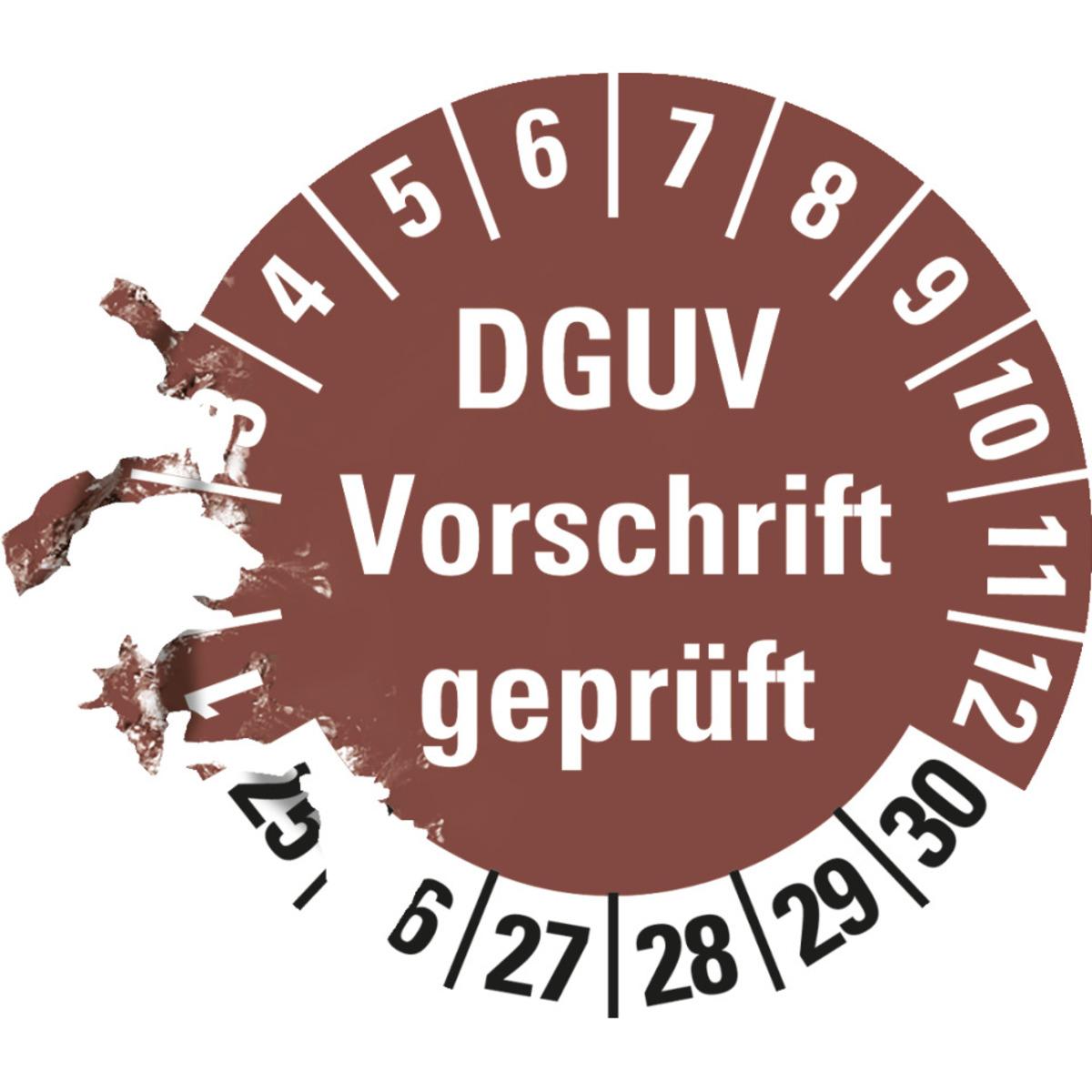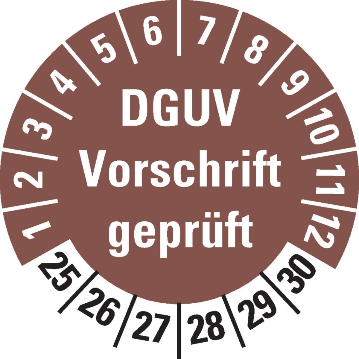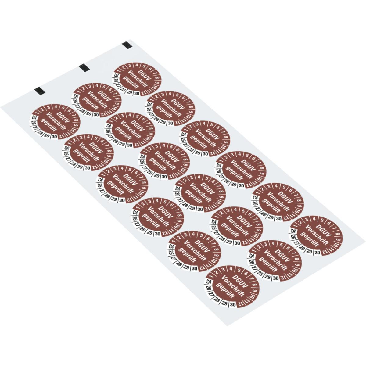 Auswahl: Prüfplakette DGUV Vorschrift geprüft, 25-30, braun, Dokufolie, Ø 30mm, 18/Bogen