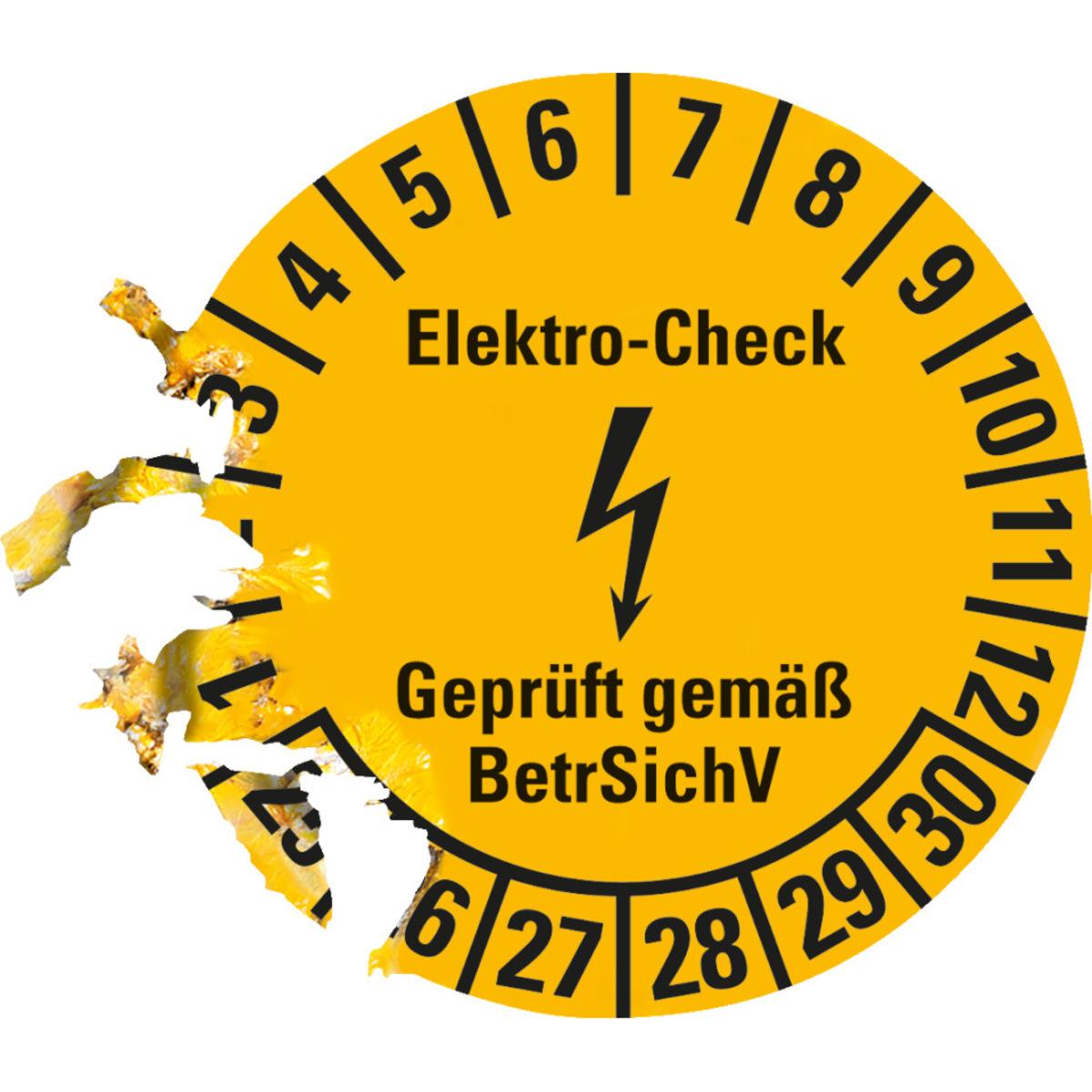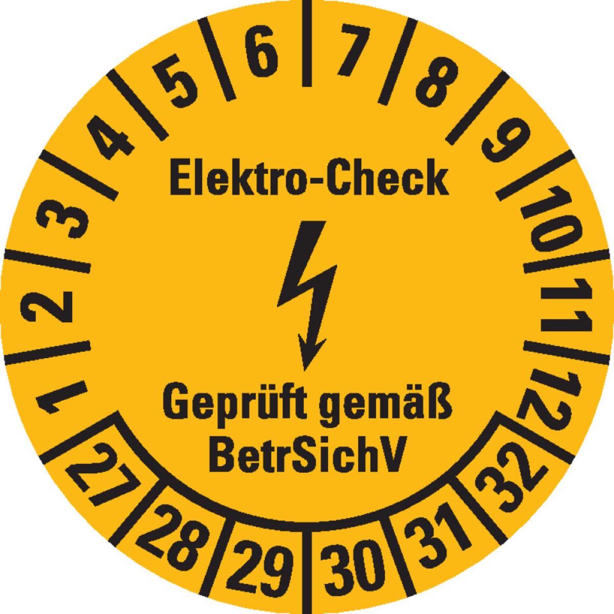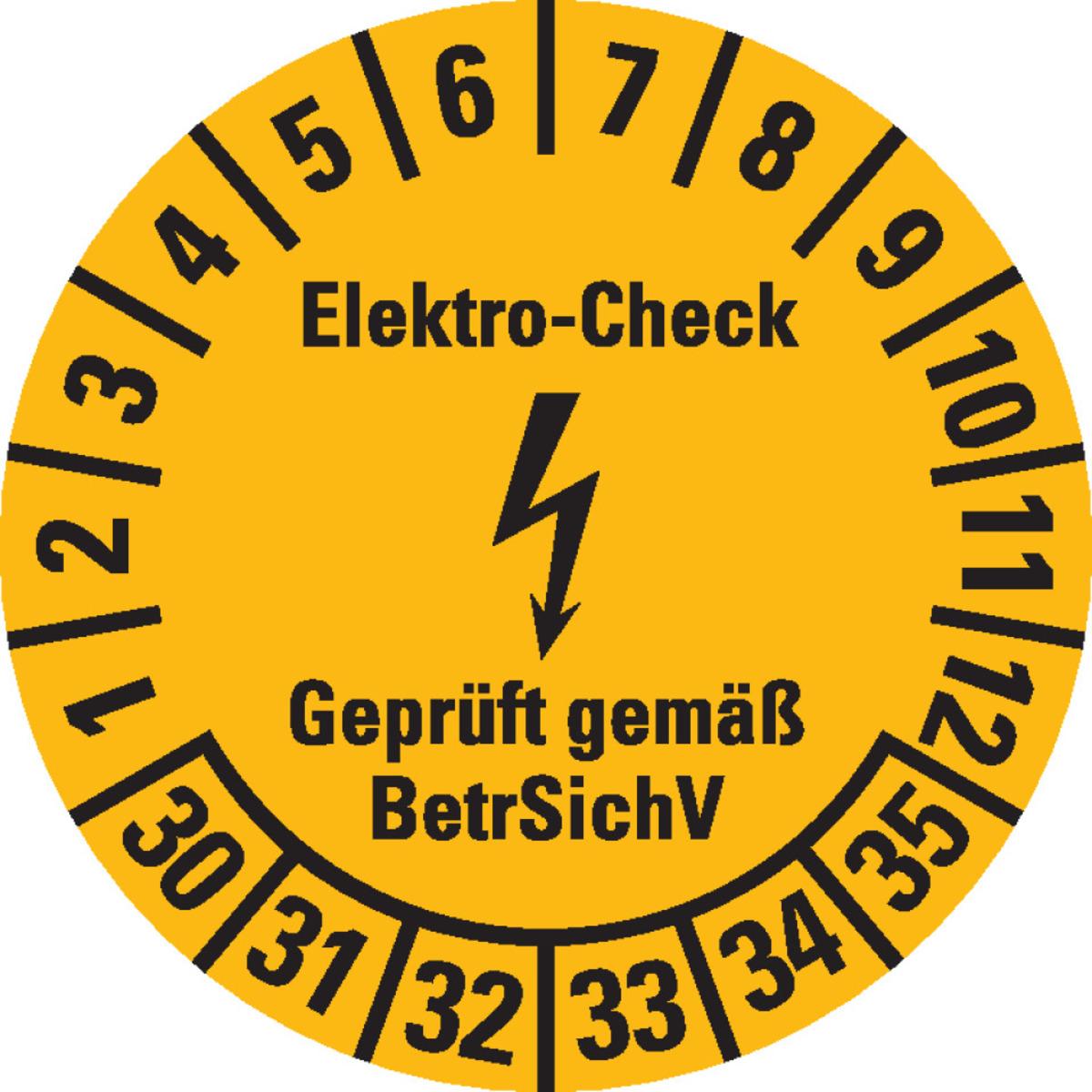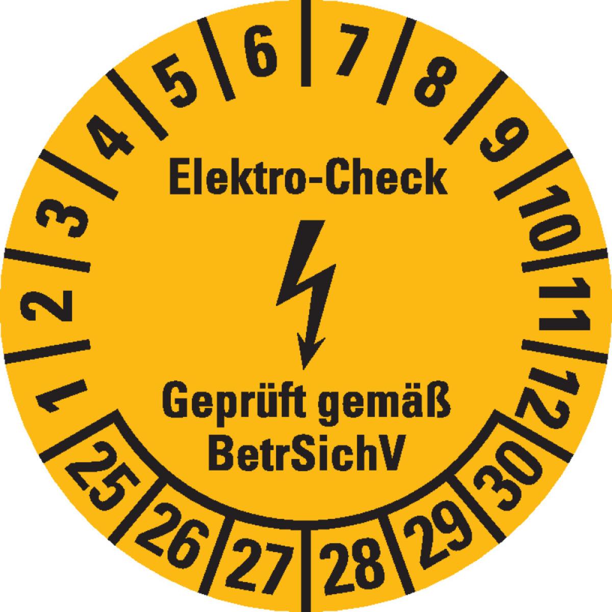 Auswahl: Prüfpl.Elektro-Check BetrSichV, 25-30, gelb/schwarz, Dokufolie, Ø 20mm, 36/Bogen