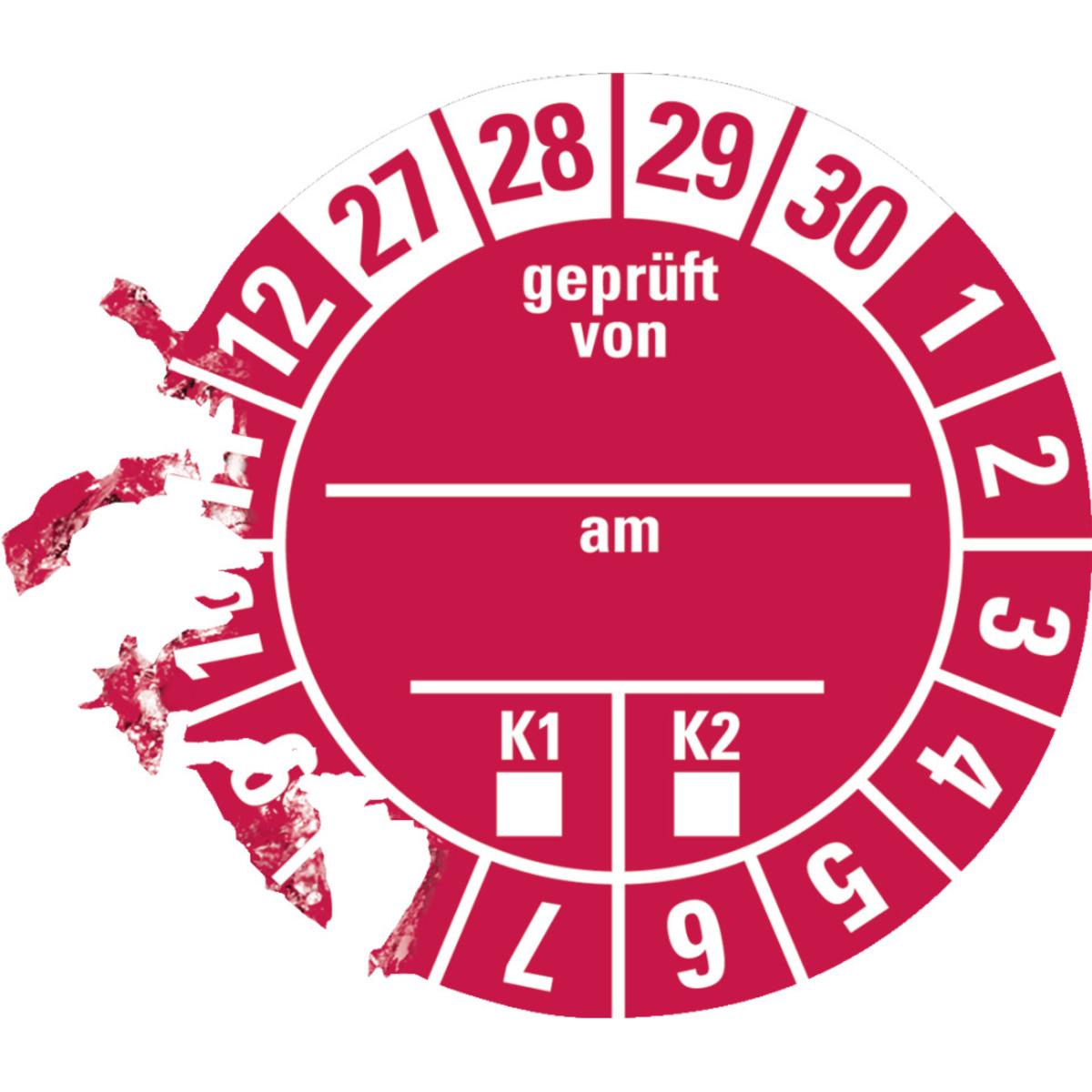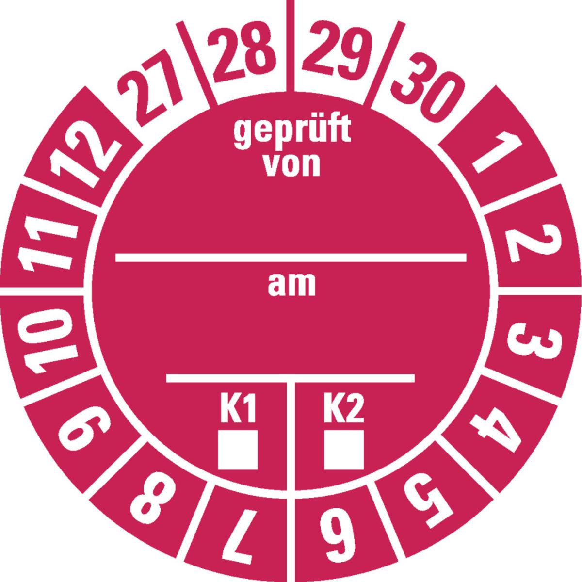 Auswahl: Prüfplakette geprüft von...am...K1 K2 27-30, rot, Dokumentenfolie, Ø 30mm, 18/Bogen