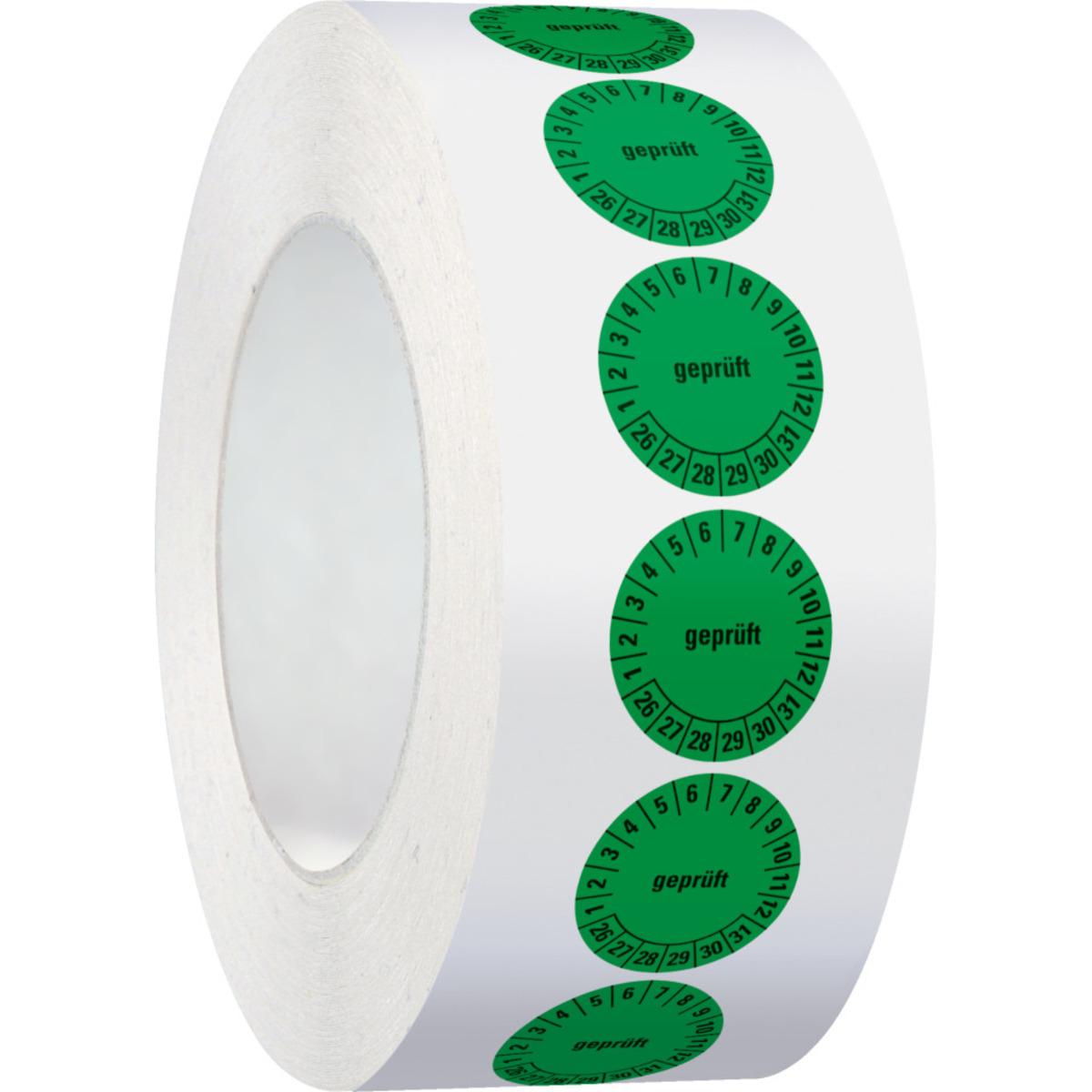 Auswahl: Prüfplakette geprüft 26-31, grün, Dokumentenfolie, selbstklebend, Ø 20mm, 500/Rolle