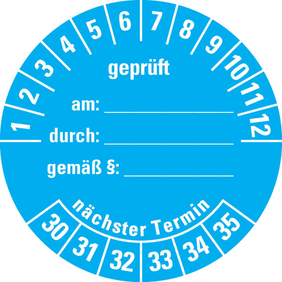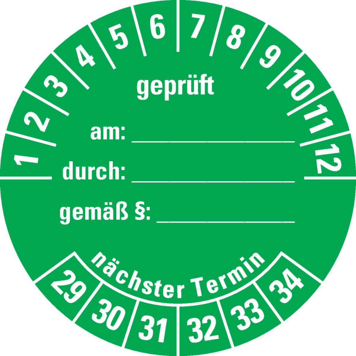 KSIGN Mehrjahresprüfplakette geprüft, am:, durch:, gemäß §:, nächster Prüftermin Ø 40 mm Dokumentenfolie Bogen