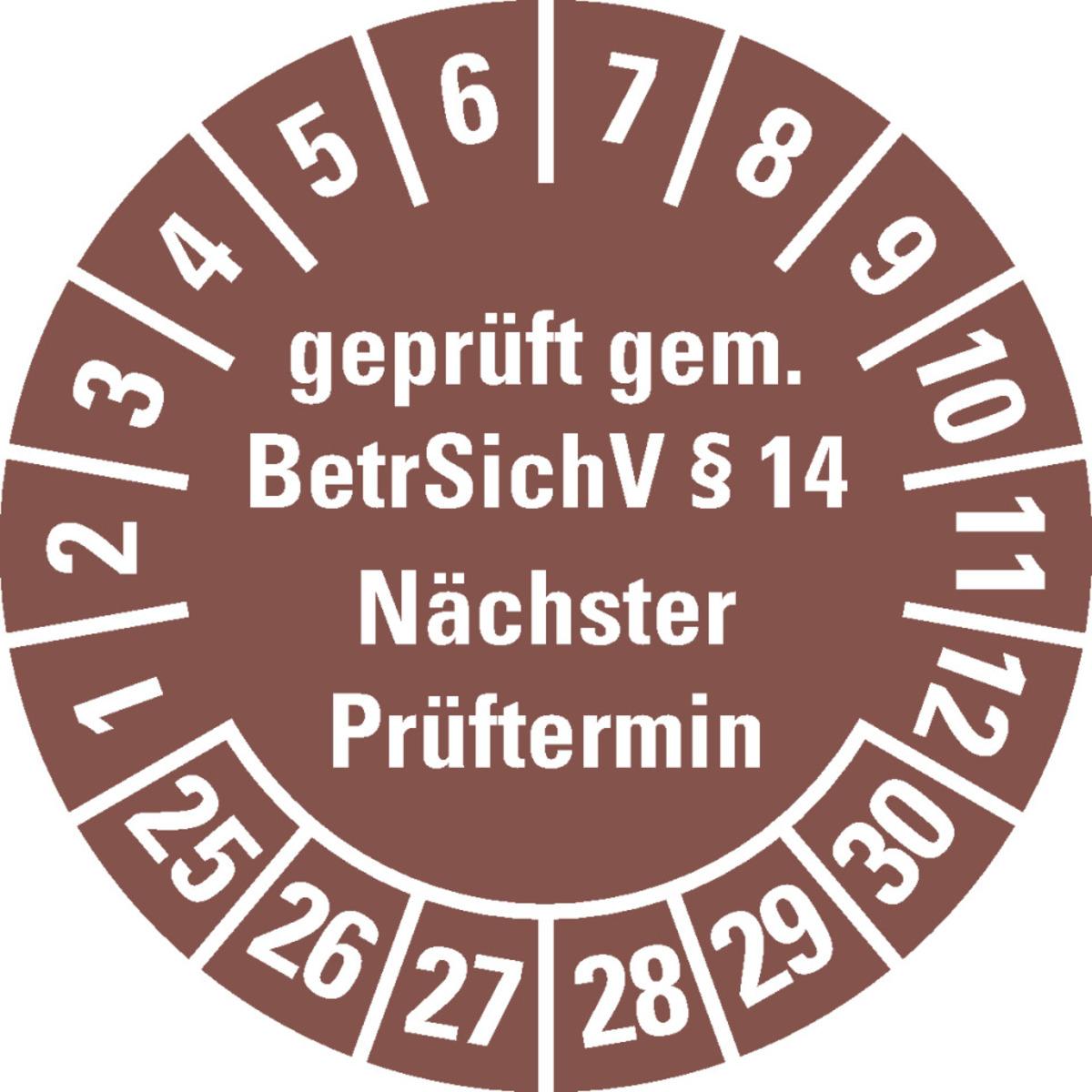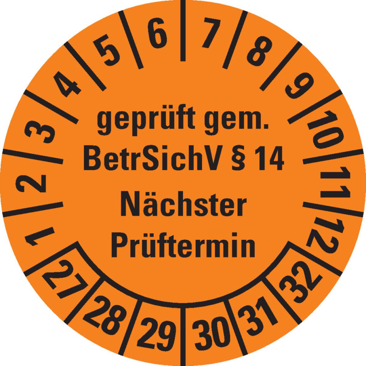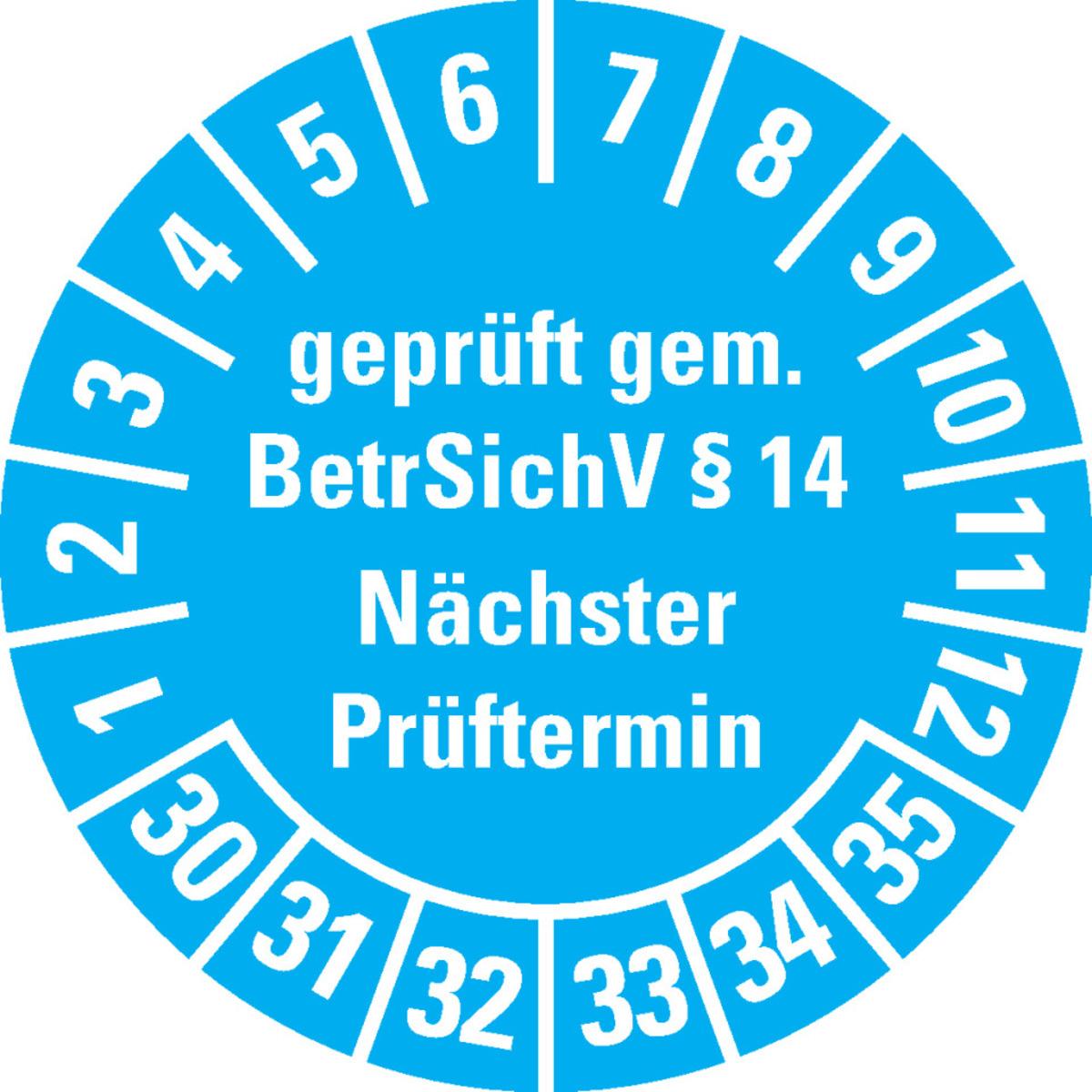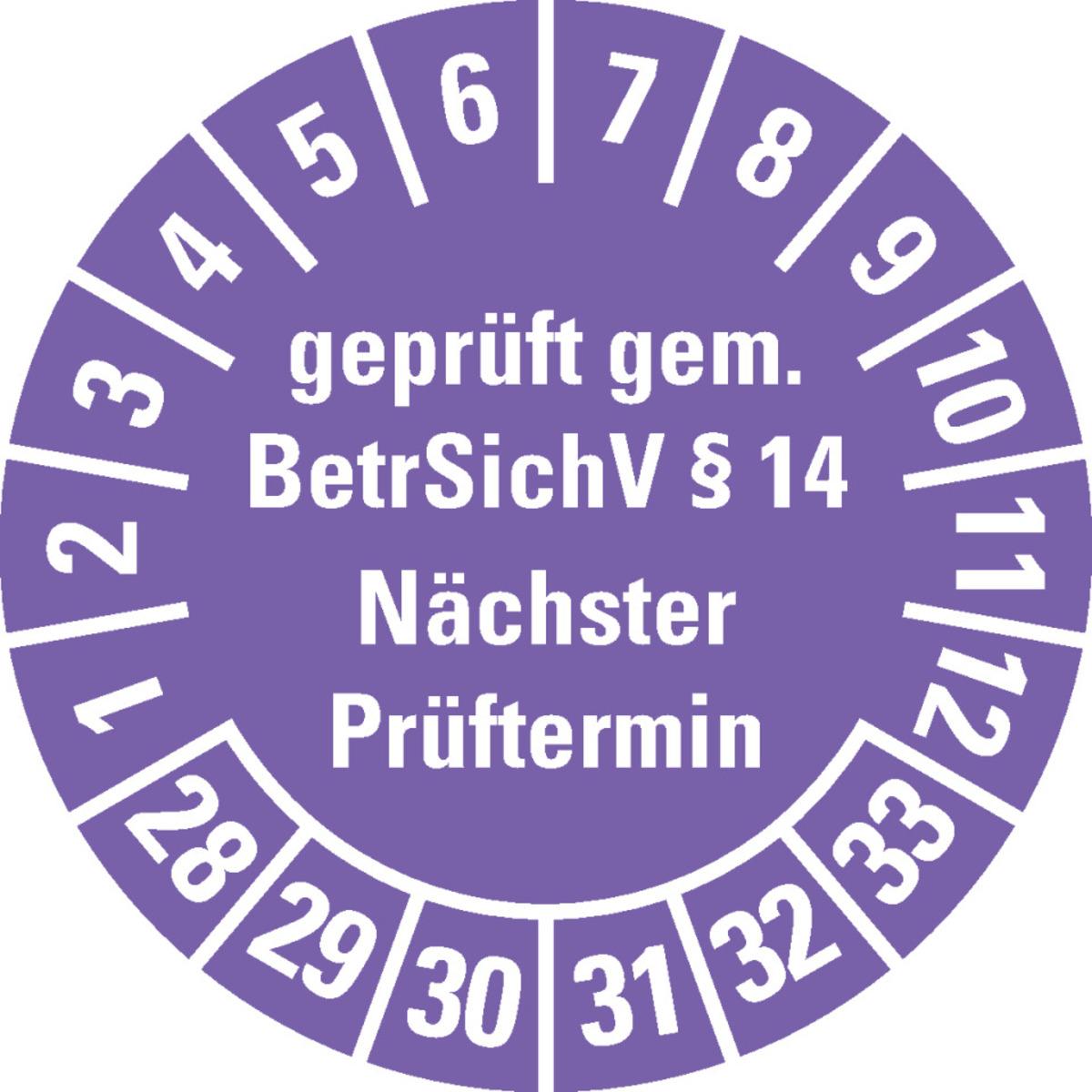 KSIGN Mehrjahresprüfplakette geprüft gem. BetrSichV § 14, Nächster Prüftermin Ø 30 mm Dokumentenfolie Bogen