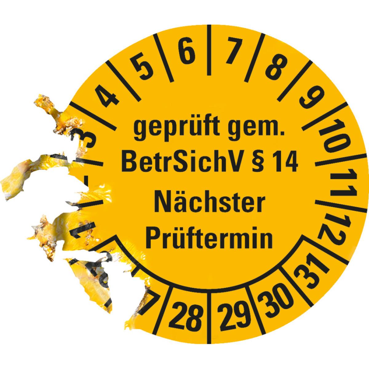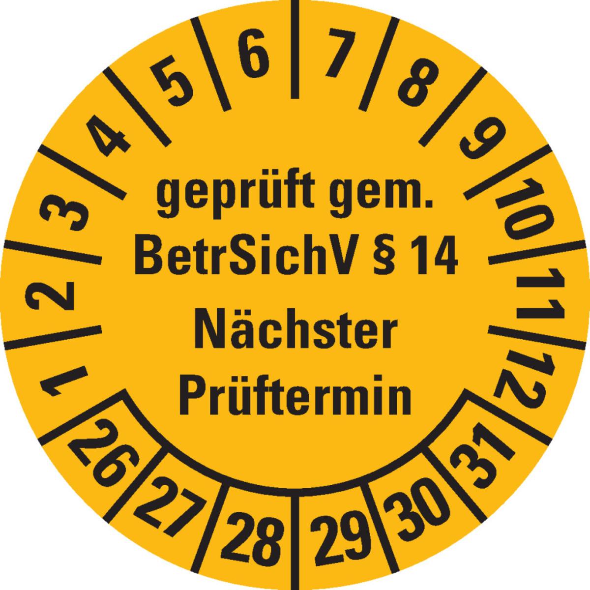 Auswahl: Prüfpl. geprüft gem. BetrSichV §14, 26-31, gelb, Dokumentenfolie, Ø30mm, 18/Bogen