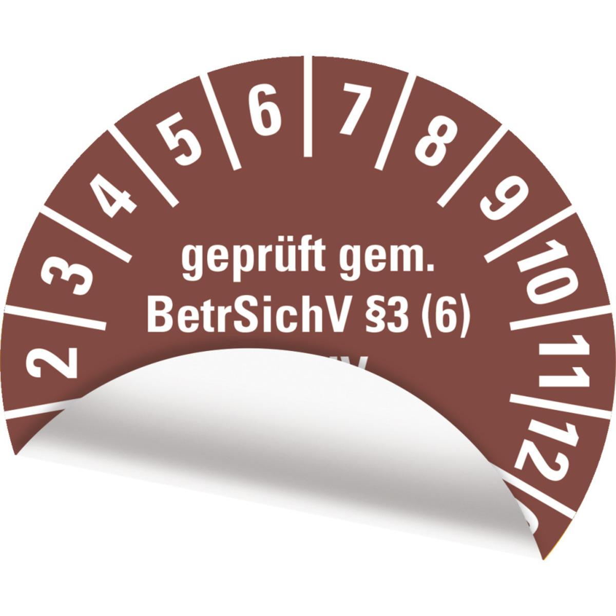 Auswahl: Prüfplakette gepr.gem.BetrSichV §3(6), DGUV, 25-30, braun, Folie, Ø30mm, 18/Bogen