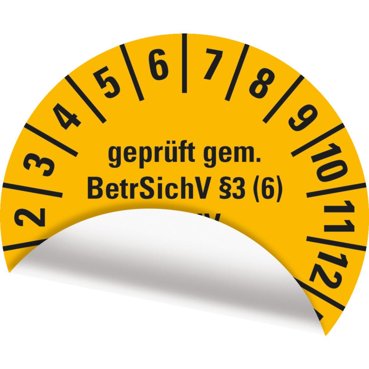 Auswahl: Prüfplakette gepr.gem.BetrSichV §3(6), DGUV, 26-31, gelb, Folie, Ø30mm, 18/Bogen