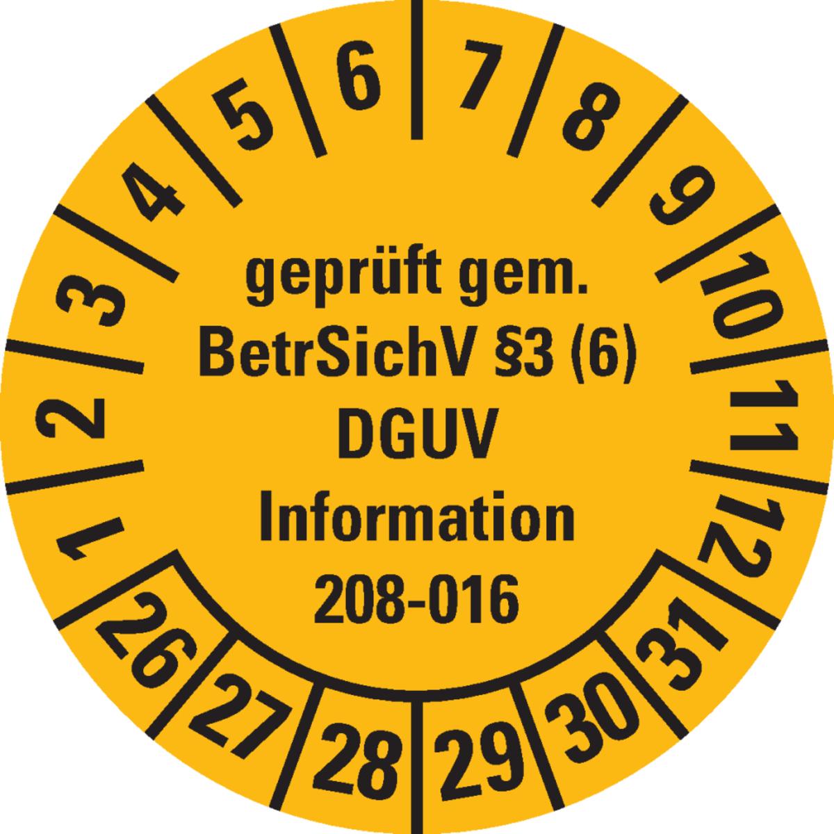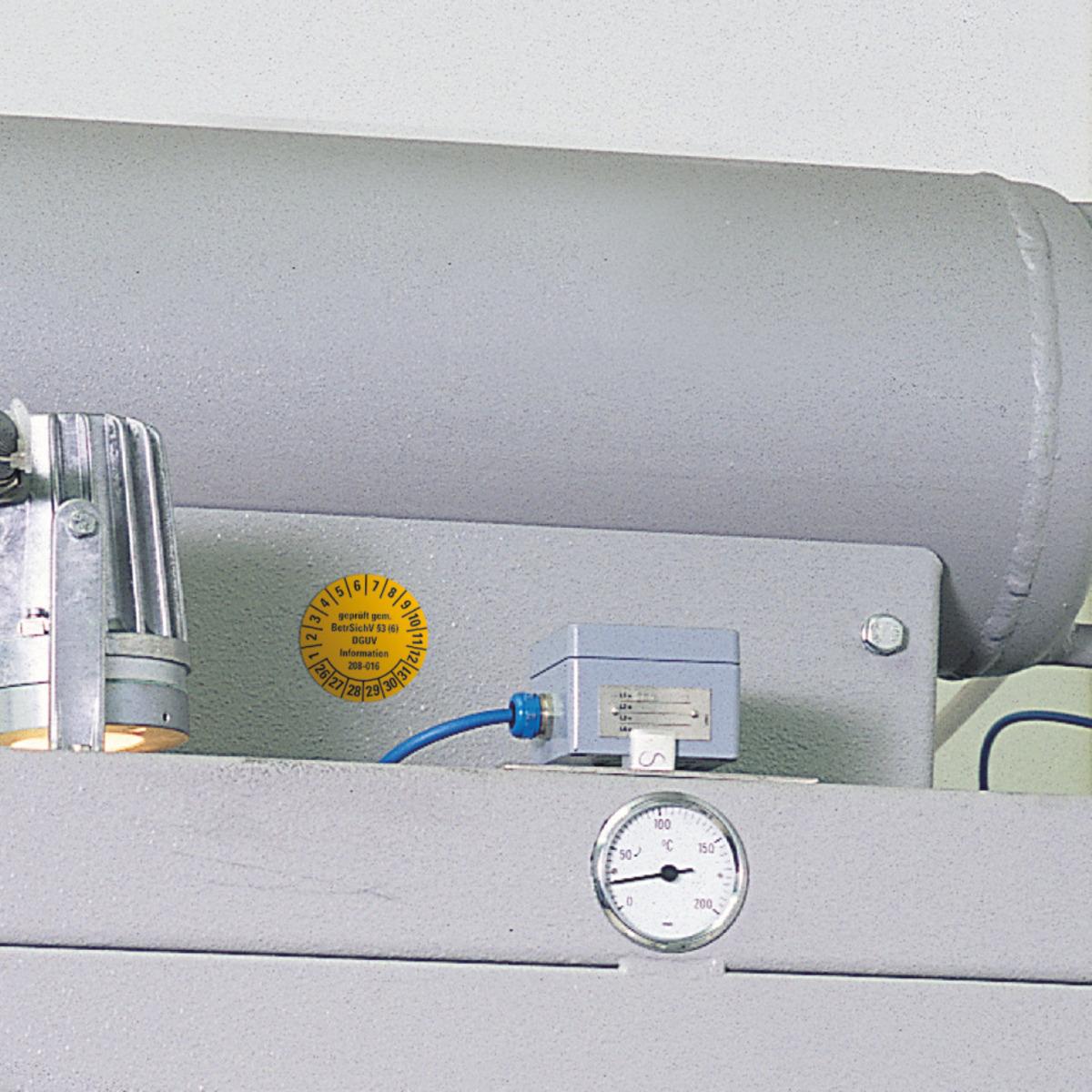 Auswahl: Prüfpl.gepr.gem.BetrSichV §3(6)DGUV, 26-31, gelb, Dokufolie, Ø 30mm, 18/Bogen