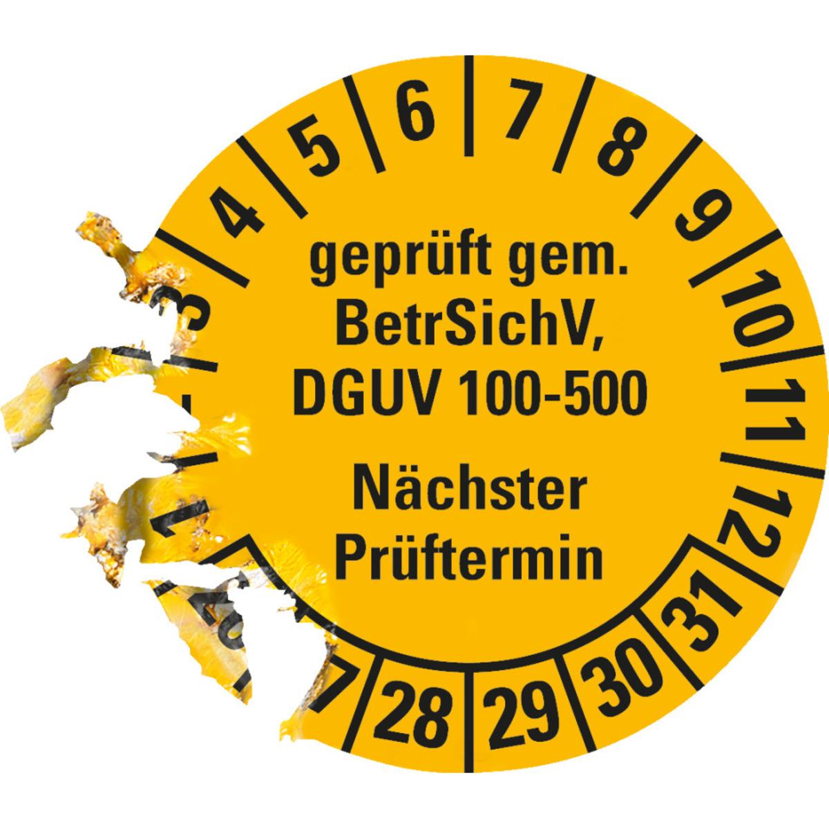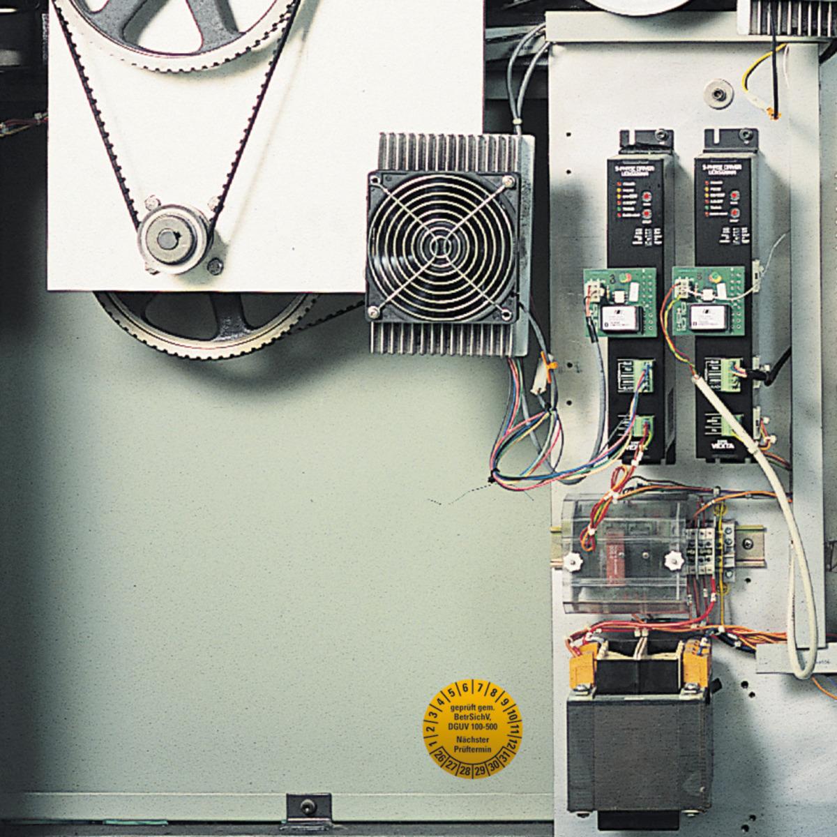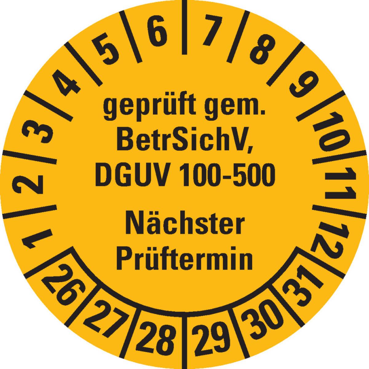 Auswahl: Prüfpl.gep.gem.BetrSichV, DGUV 100-500, NP, 26-31, gelb, Dokufolie, Ø30mm, 18/Bogen