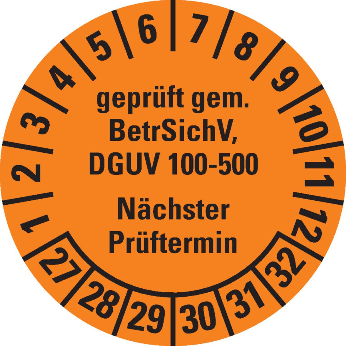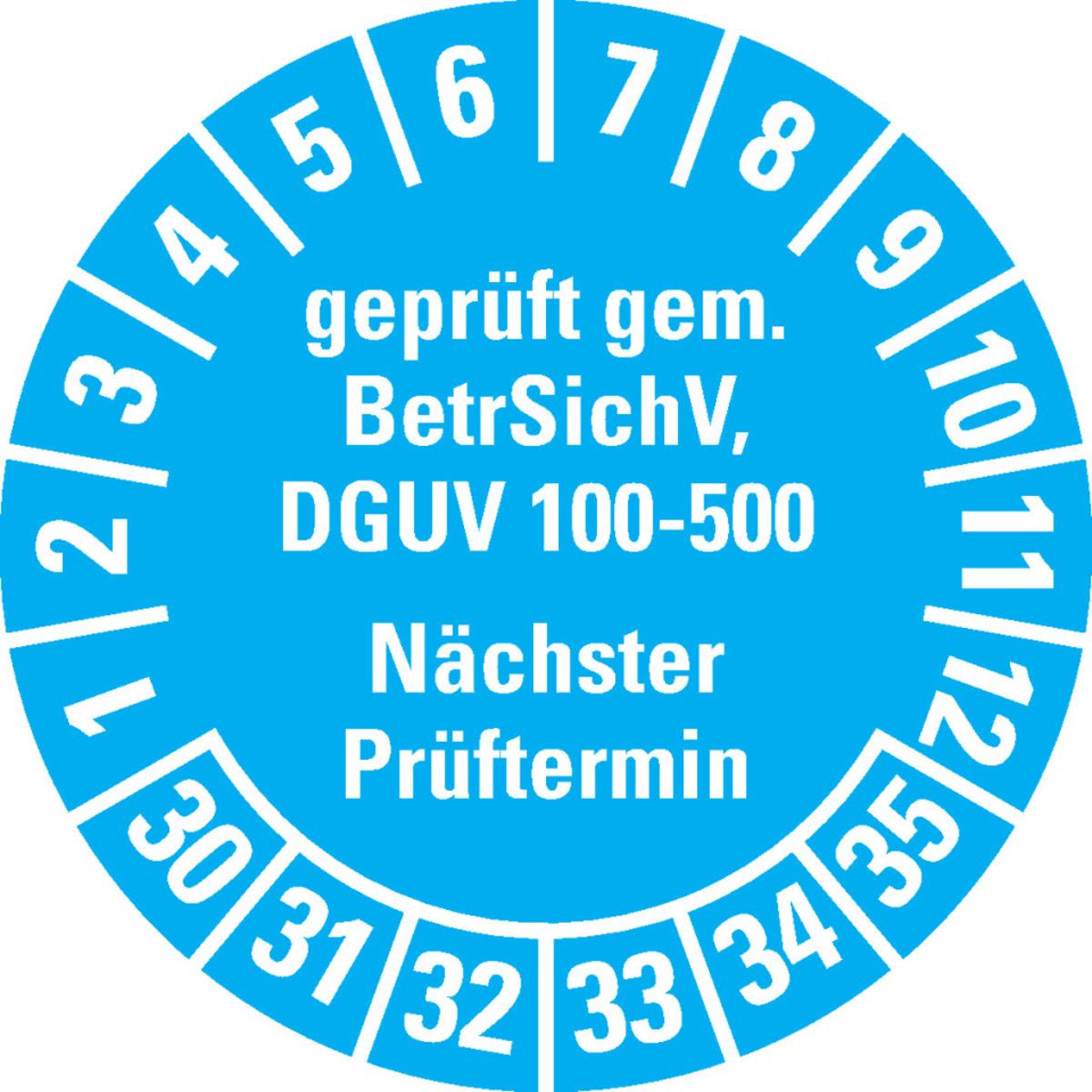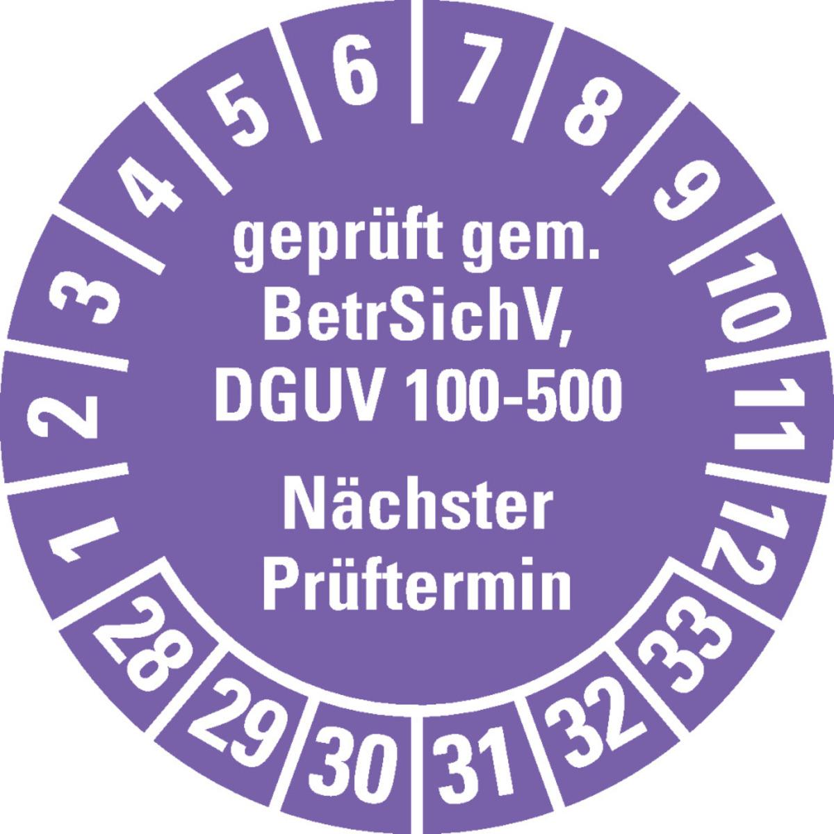 KSIGN Mehrjahresprüfplakette geprüft gem. BetrSichV, DGUV 100-500, Nächster Prüftermin Ø 30 mm Dokumentenfolie Bogen