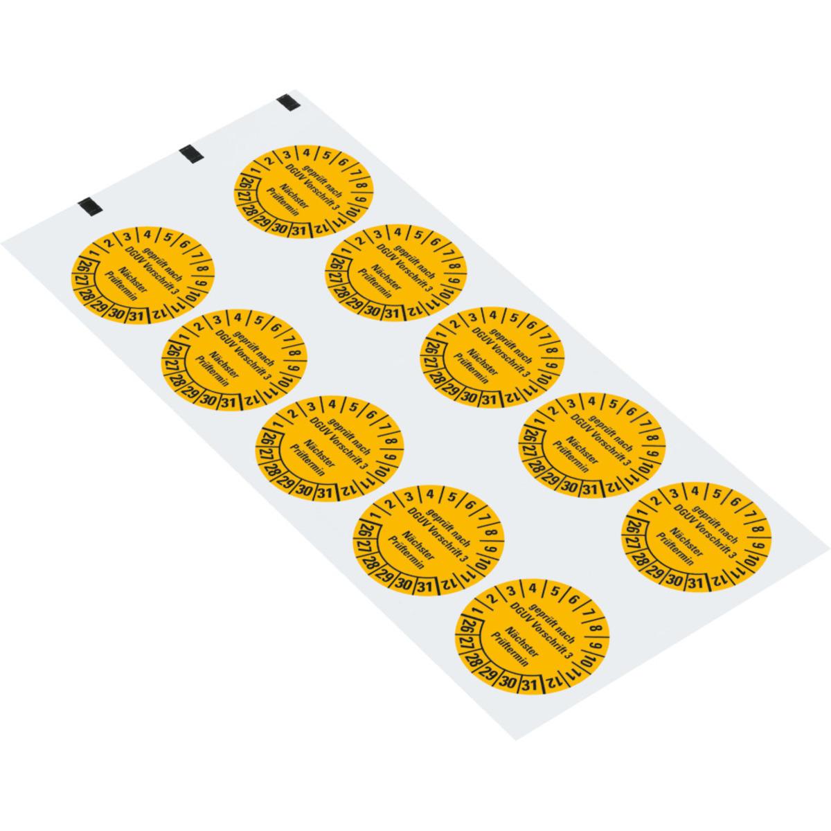 Auswahl: Prüfpl.gepr.n.DGUV Vorschrift 3 NP, 26-31, gelb, Folie, ablösbar, Ø 35mm, 10/Bogen