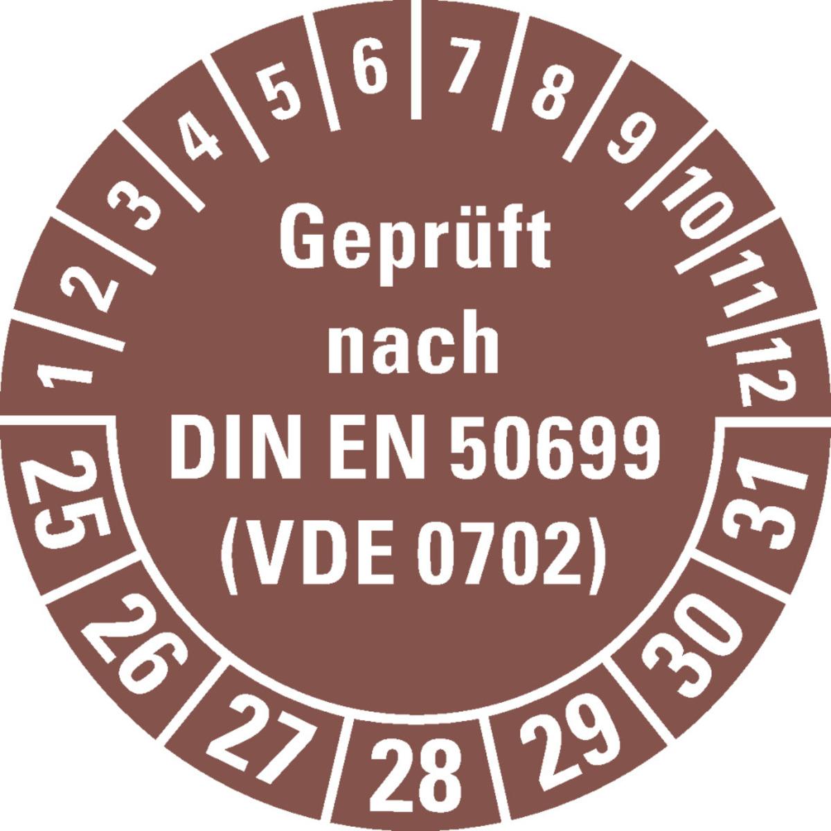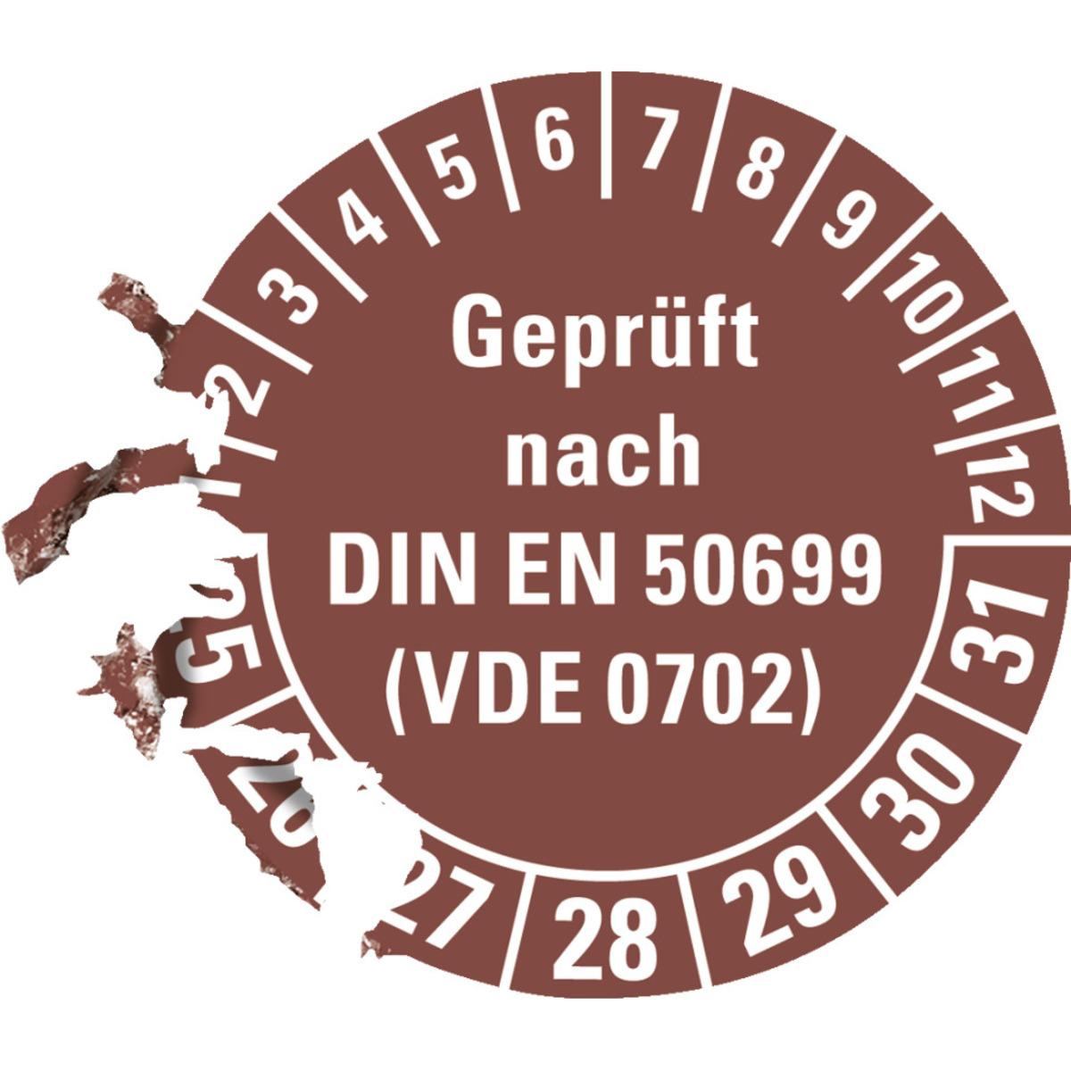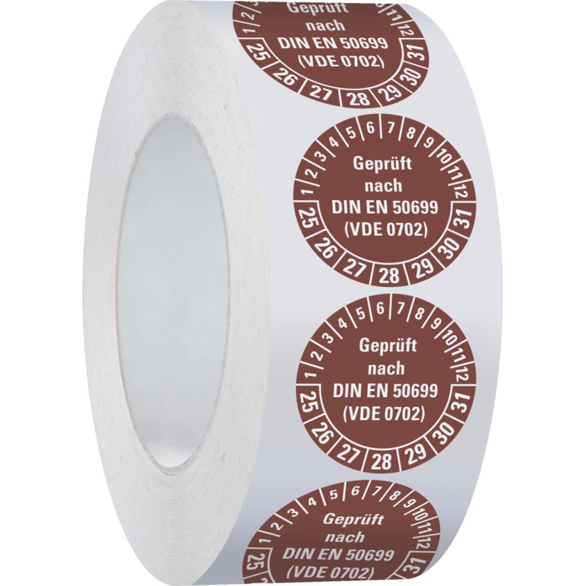 Auswahl: Prüfpl.Gepr.n.DIN EN 50699(VDE 0702) 25-31, braun, Dokumentenfolie, Ø 30mm, 500/Roll