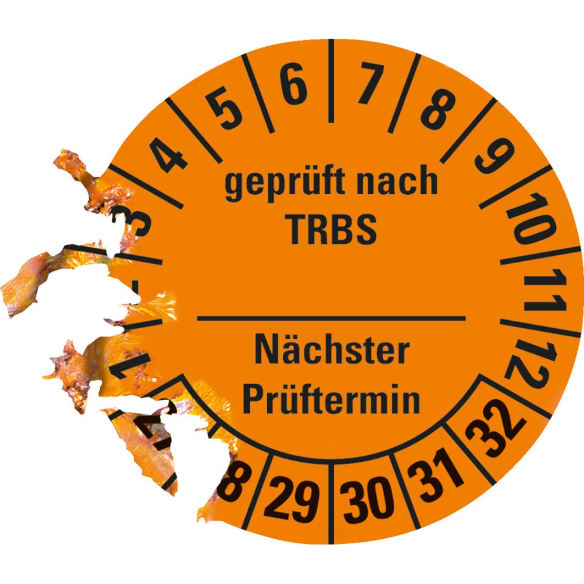 Auswahl: Prüfplakette TRBS näch.Prüft., Selbstbes, 27-32, orange, Dokufolie, Ø30mm, 18/Bogen