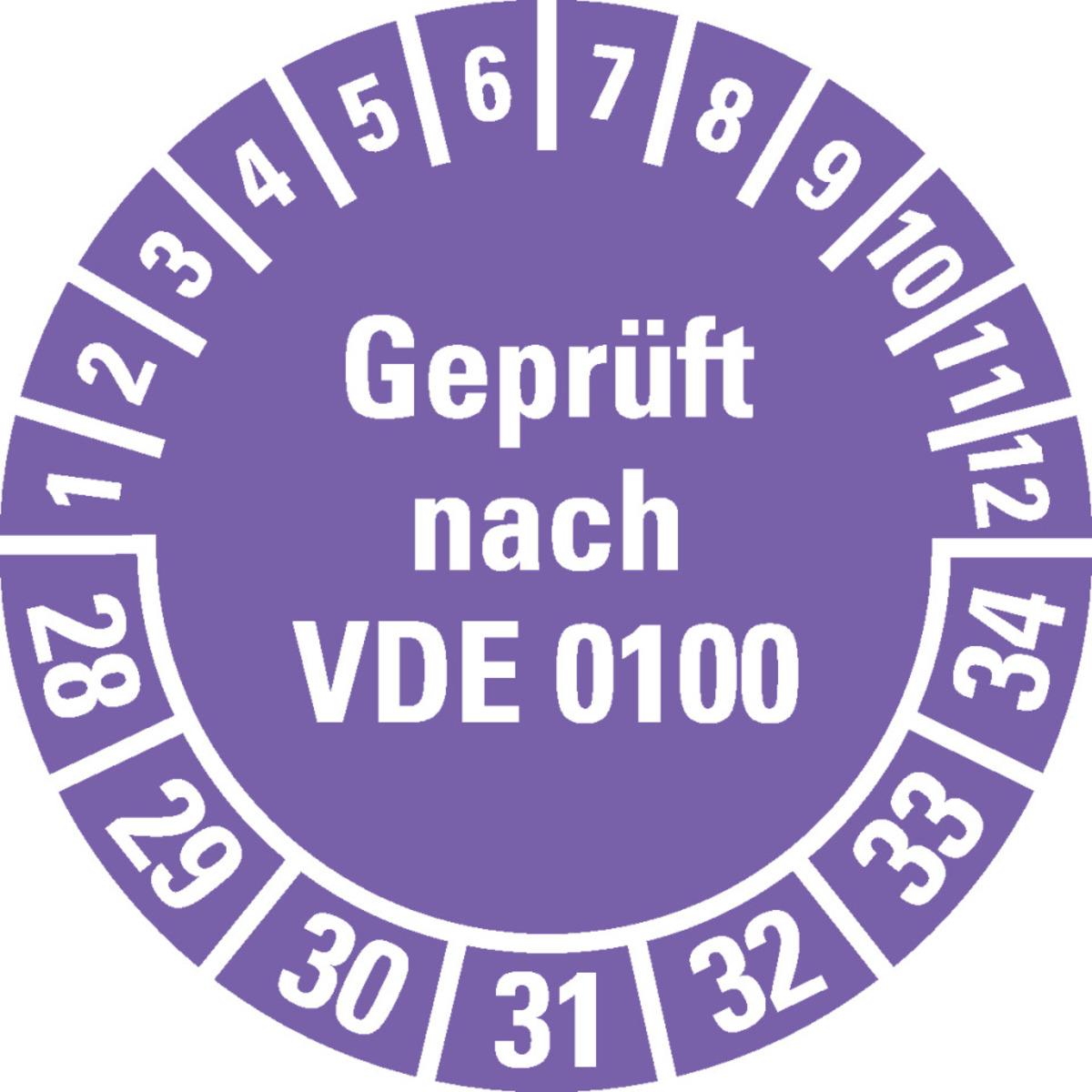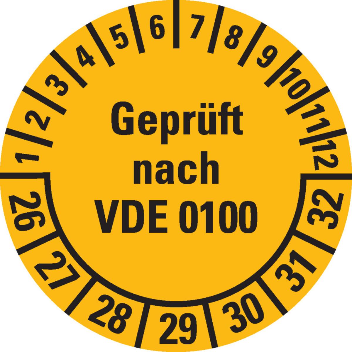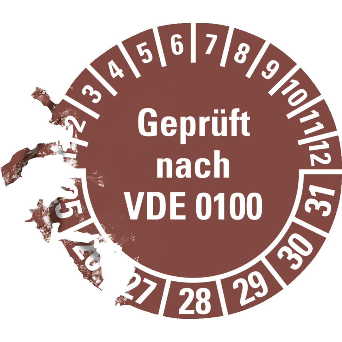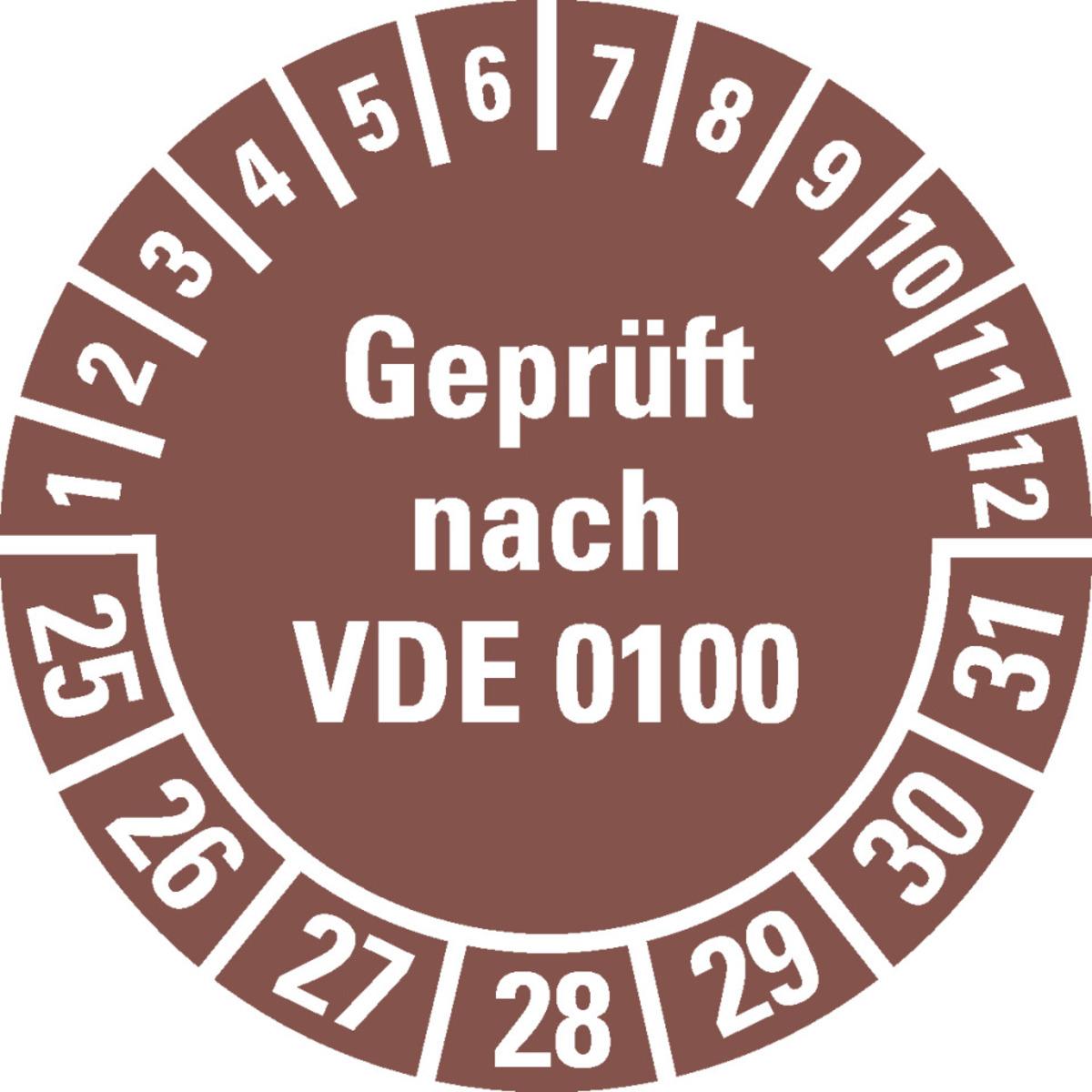 Auswahl: Prüfplakette Geprüft nach VDE 0100 25-31, braun, Dokumentenfolie, Ø30mm, 18/Bogen