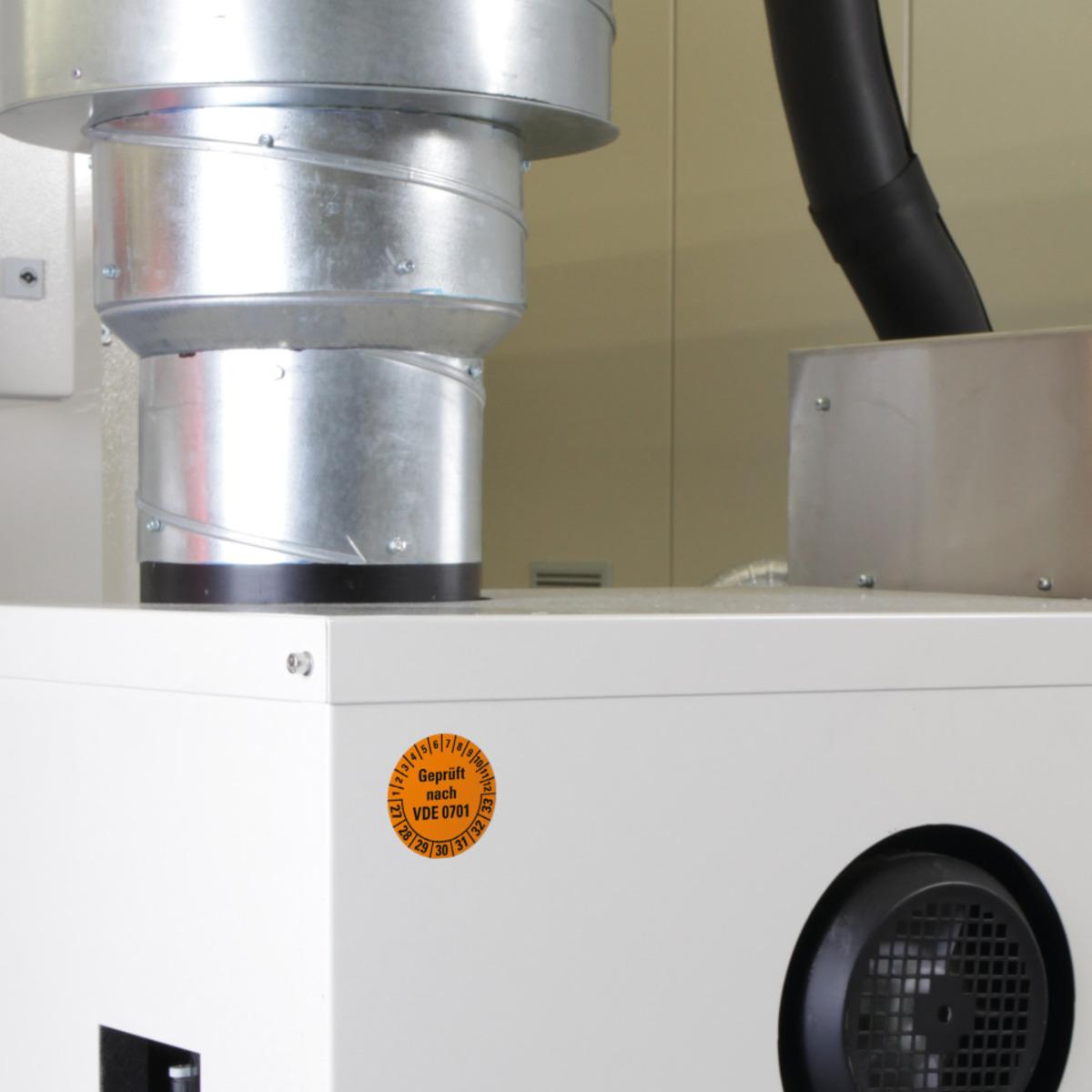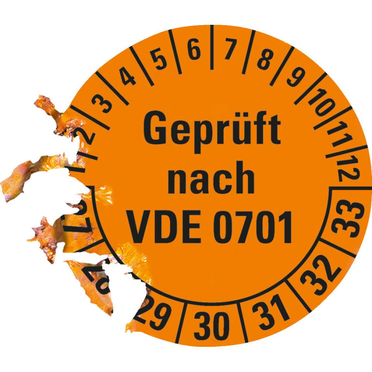 Auswahl: Prüfplakette geprüft nach VDE 0701, 27-33, orange, Dokumentenfolie, Ø 30mm, 108/Heft