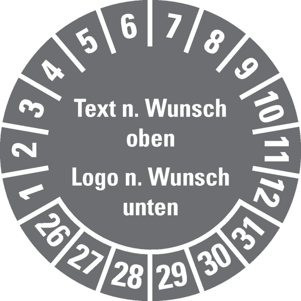 Auswahl: Prüfplakette, Text oben/Logo unten, Monatsring, Dokufolie, selbstkl., Ø 40mm, 10/Bogen