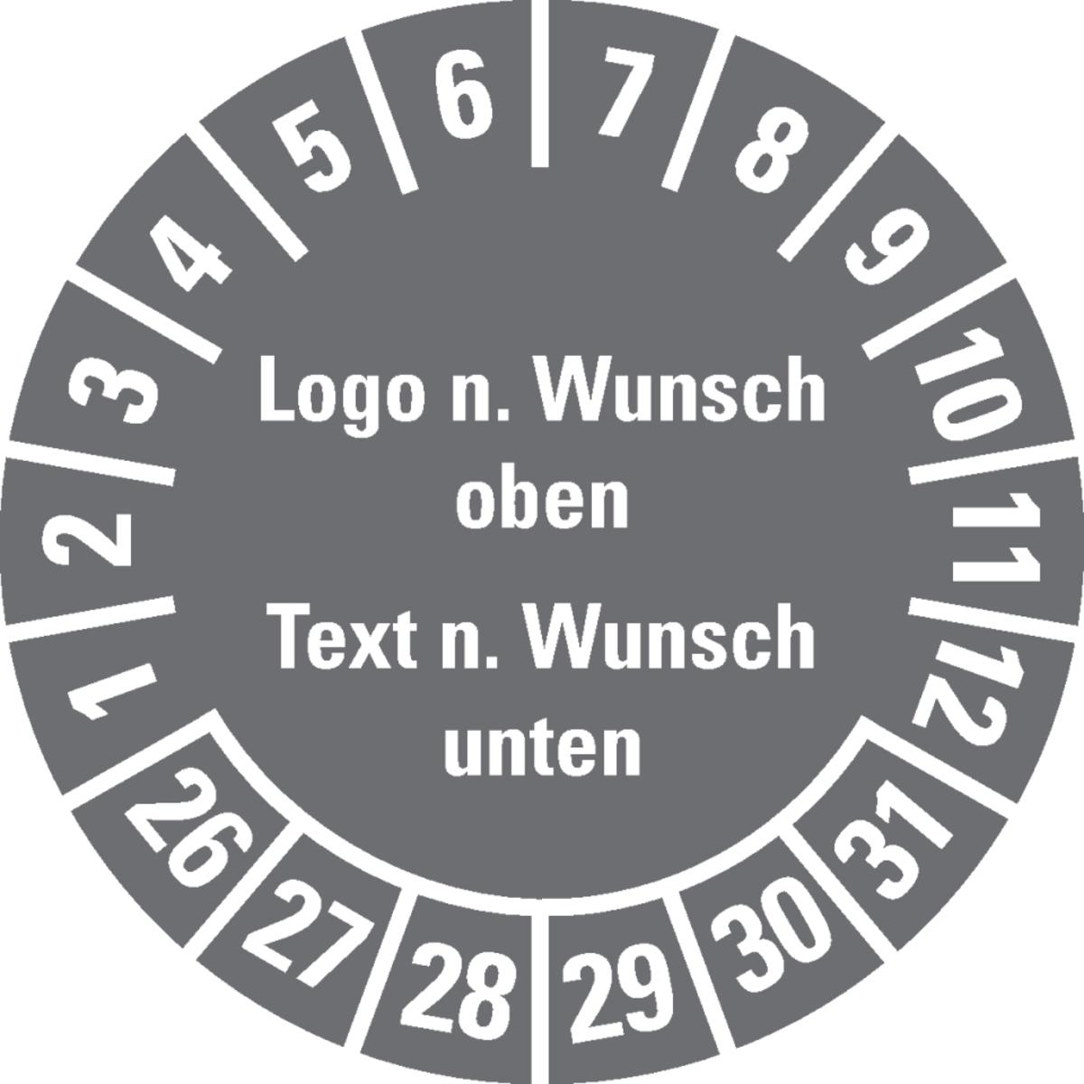 Mehrjahresprüfplakette nach Wunsch, mit Logo oben/Text unten und Monatsring