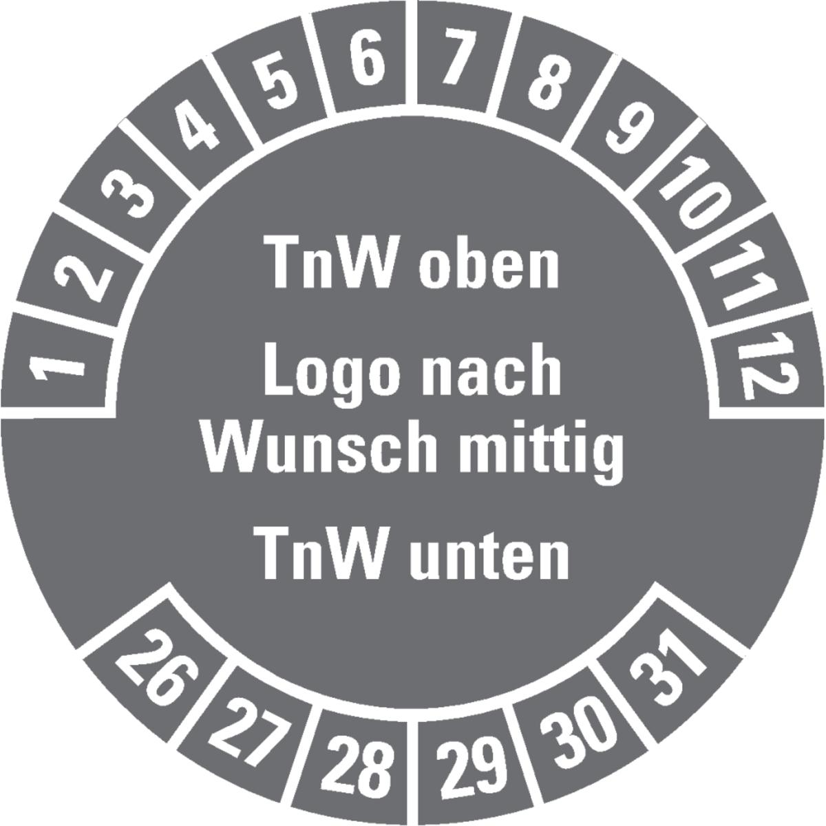 Auswahl: Prüfplakette, Text o., Logo mittig, Text/Monatskranz unten, Dokufolie, Ø30mm, 18/Bogen