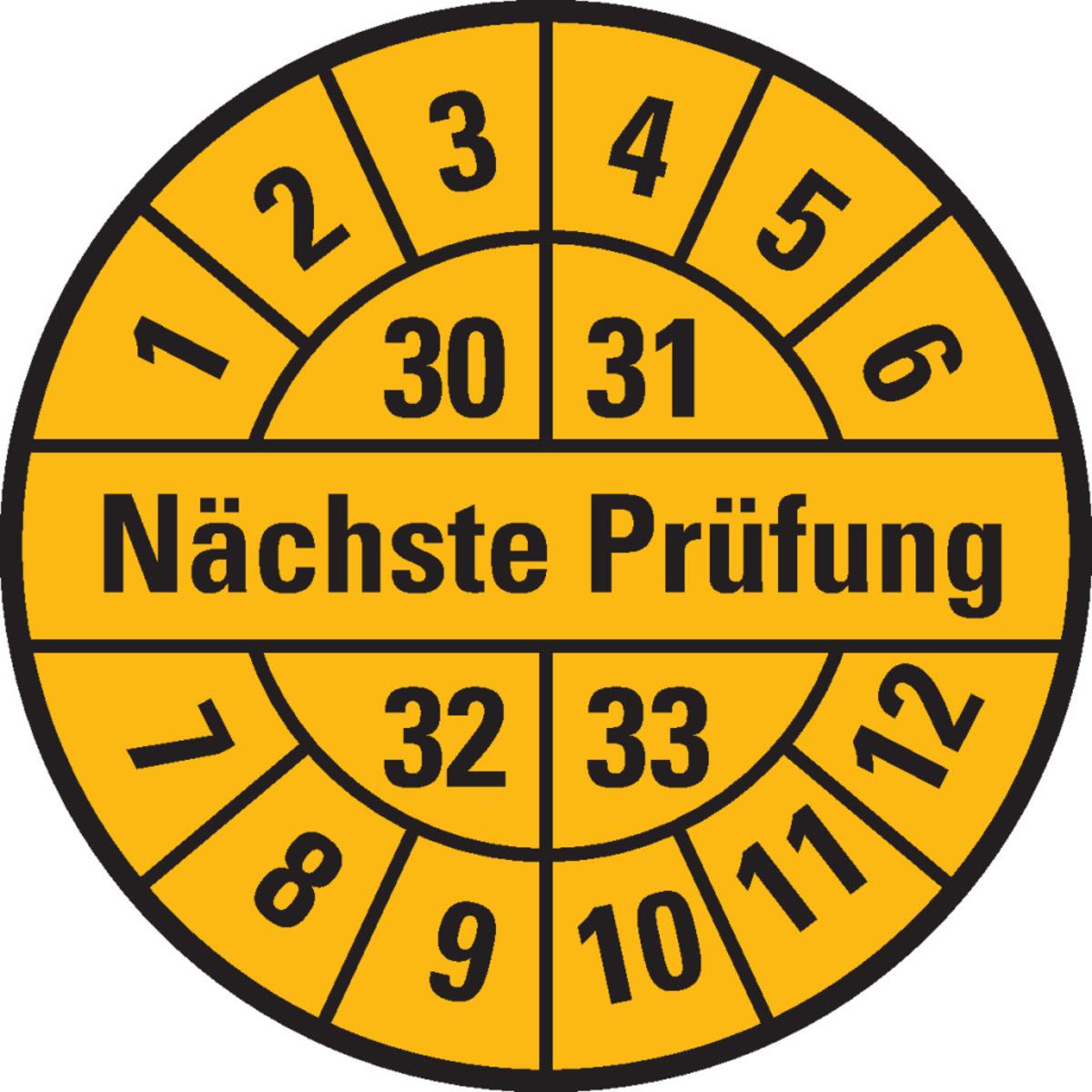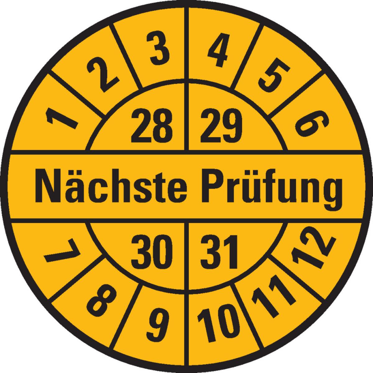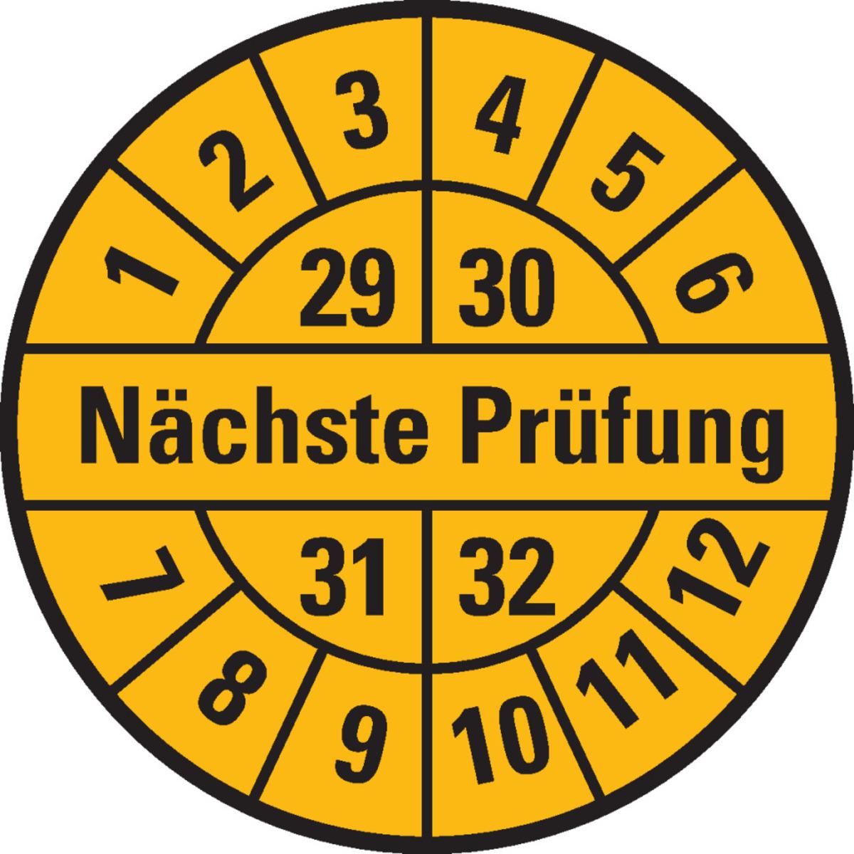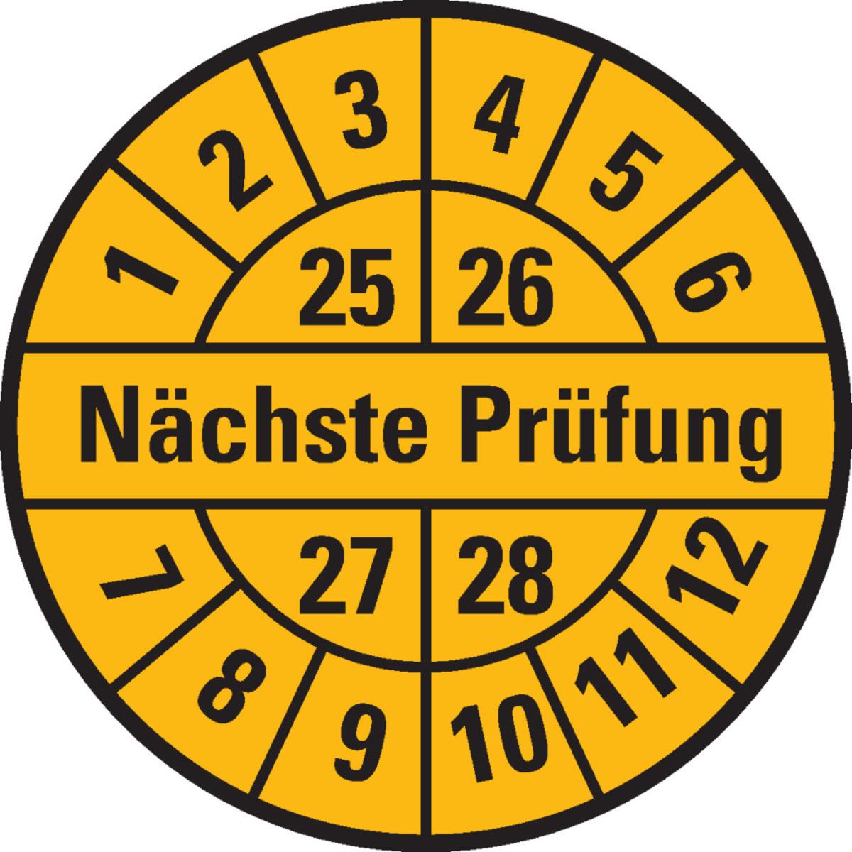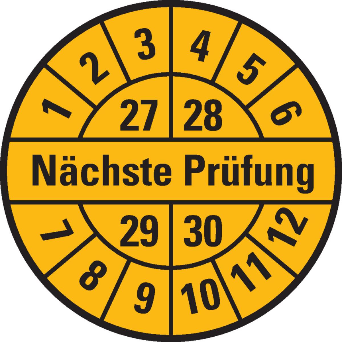 Mehrjahresprüfplakette "Nächster Prüftermin" zur Einhaltung von Prüffristen und Erleichterung der Terminkontrolle.