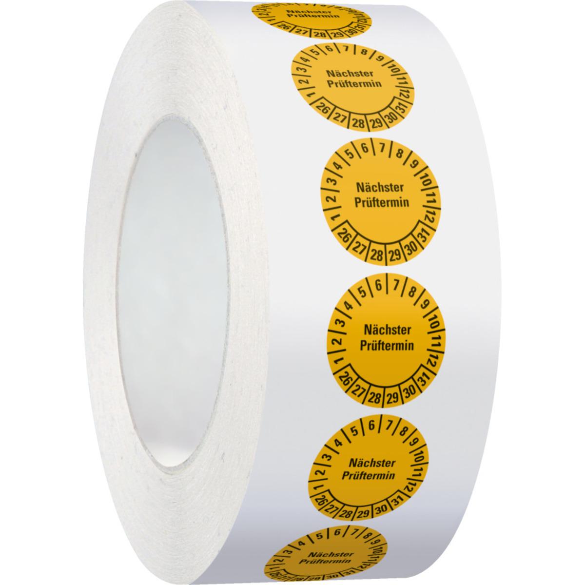 Auswahl: Prüfplakette Nächster Prüftermin 26-31, gelb, Dokumentenfolie, Ø 20mm, 500/Rolle