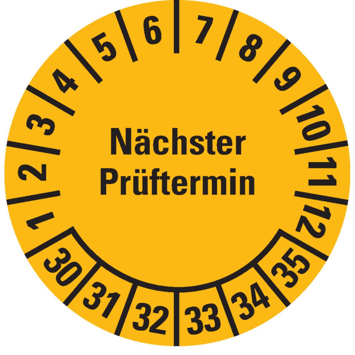Mehrjahresprüfplakette "Nächster Prüftermin" zur Einhaltung von Prüffristen und Erleichterung der Terminkontrolle.