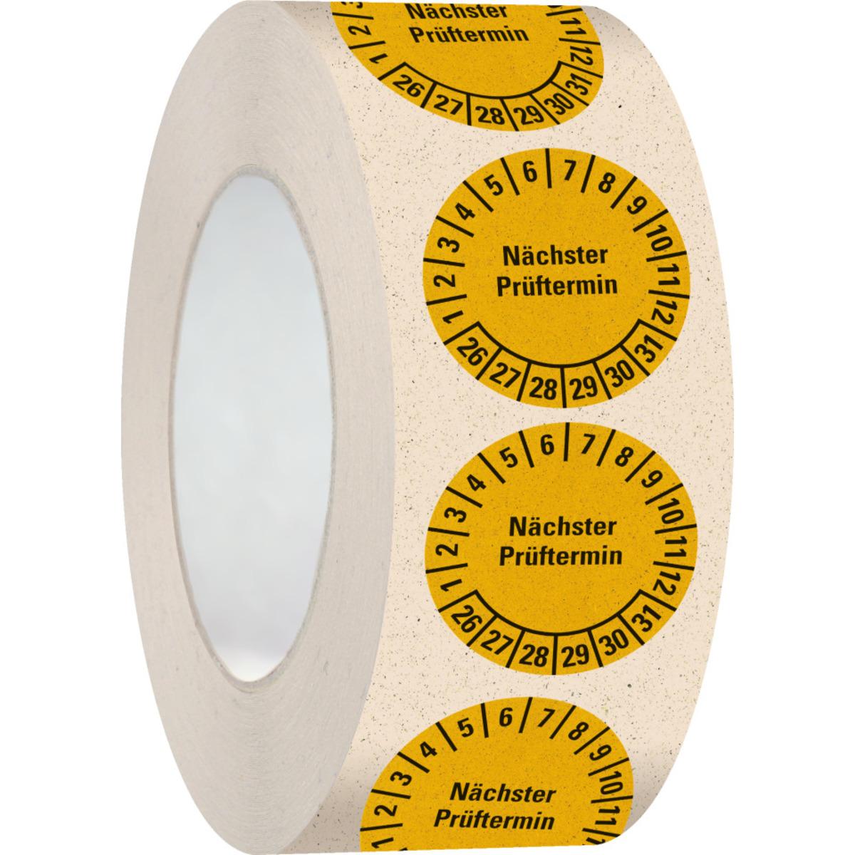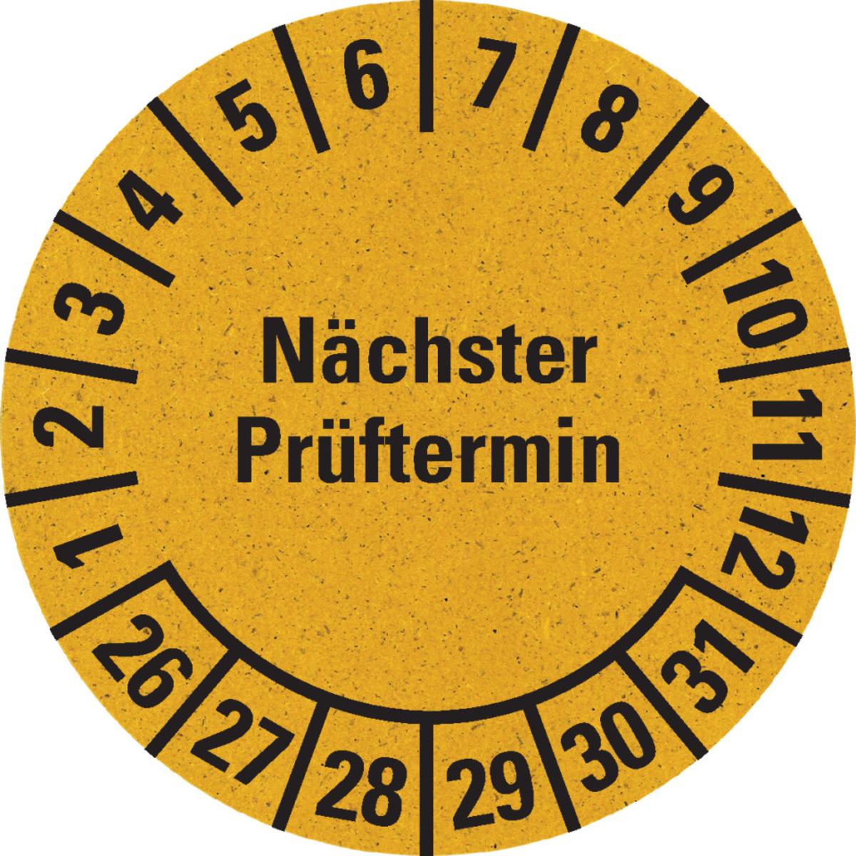 Auswahl: Prüfplakette Nächster Prüftermin 26-31, gelb, Primärfaser-Graspapier, Ø 30mm, 500/RO