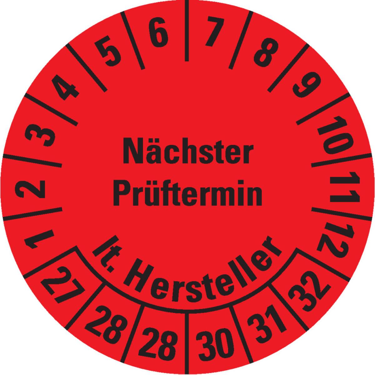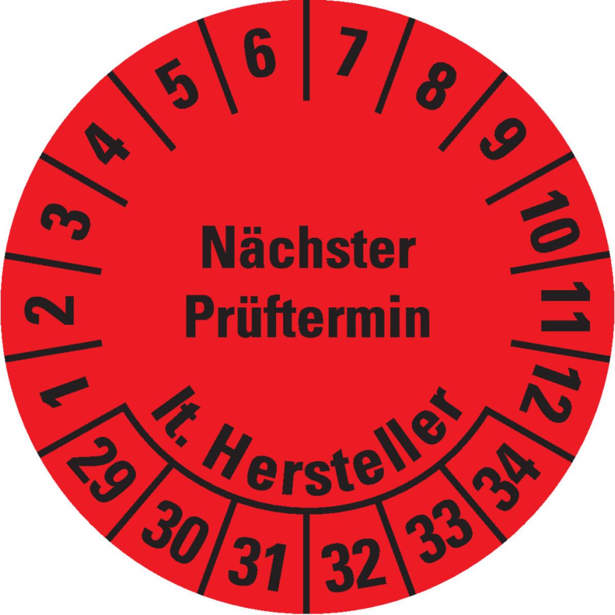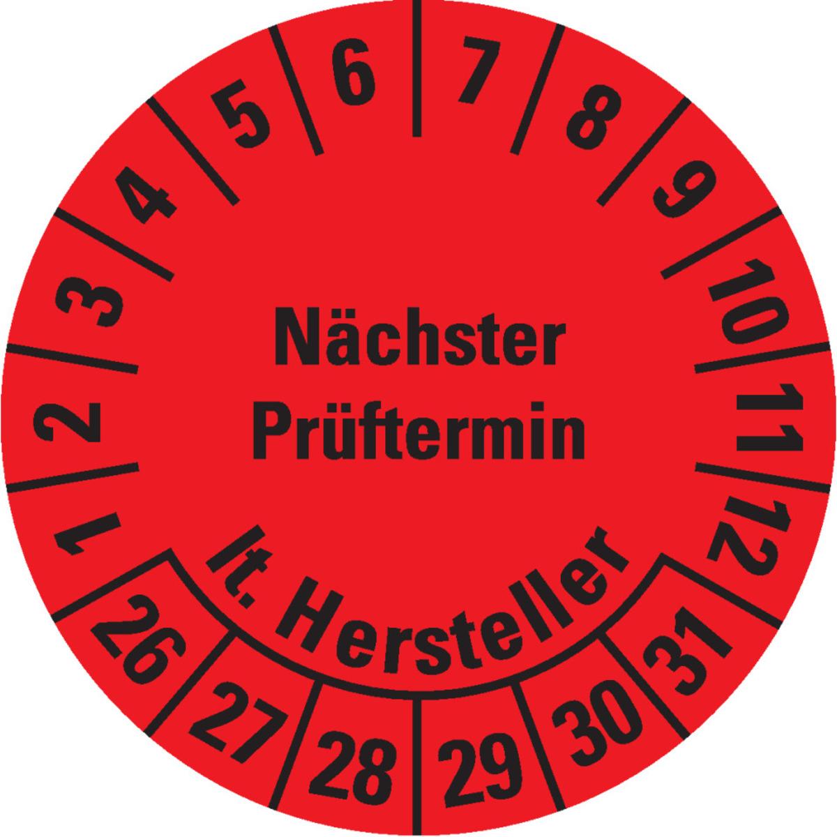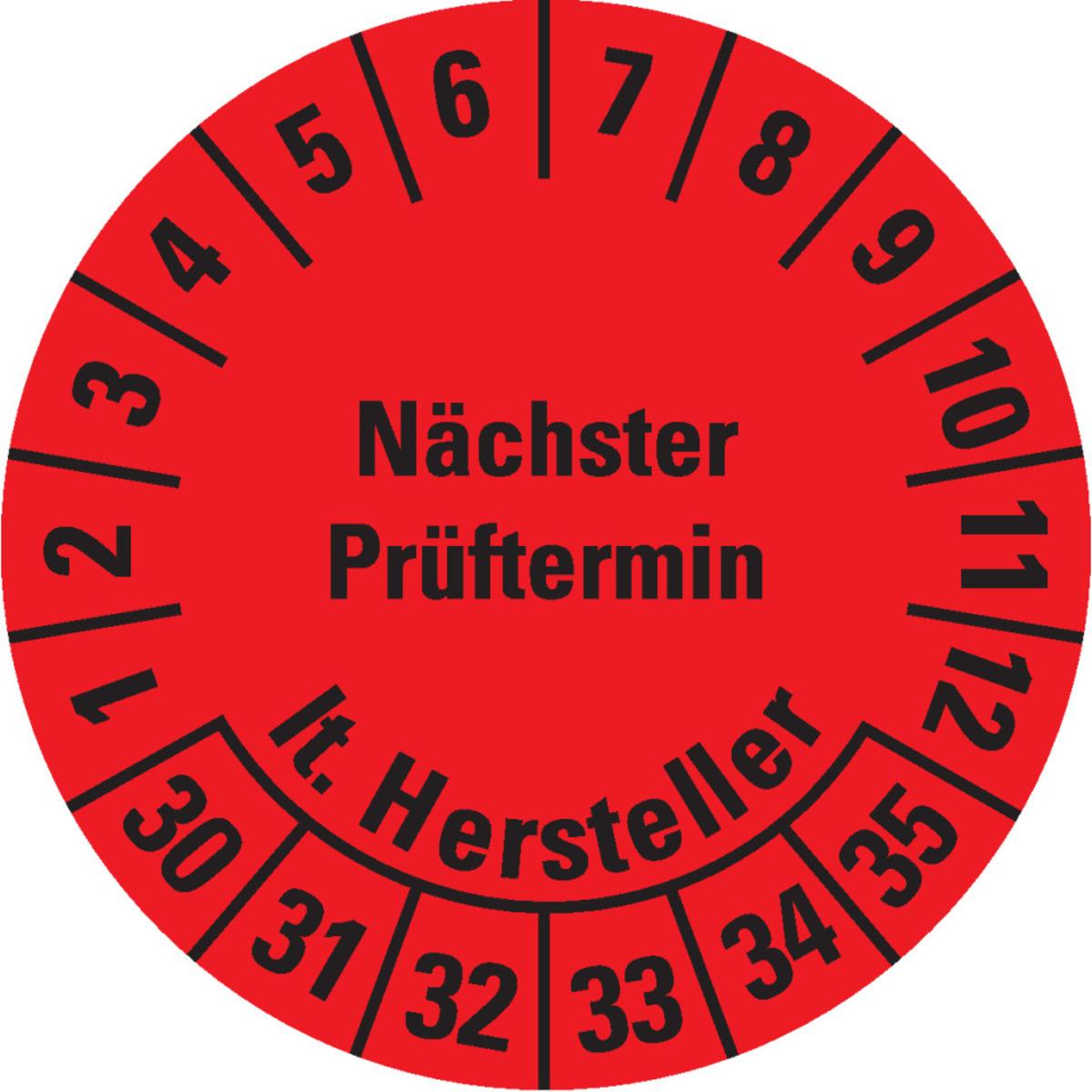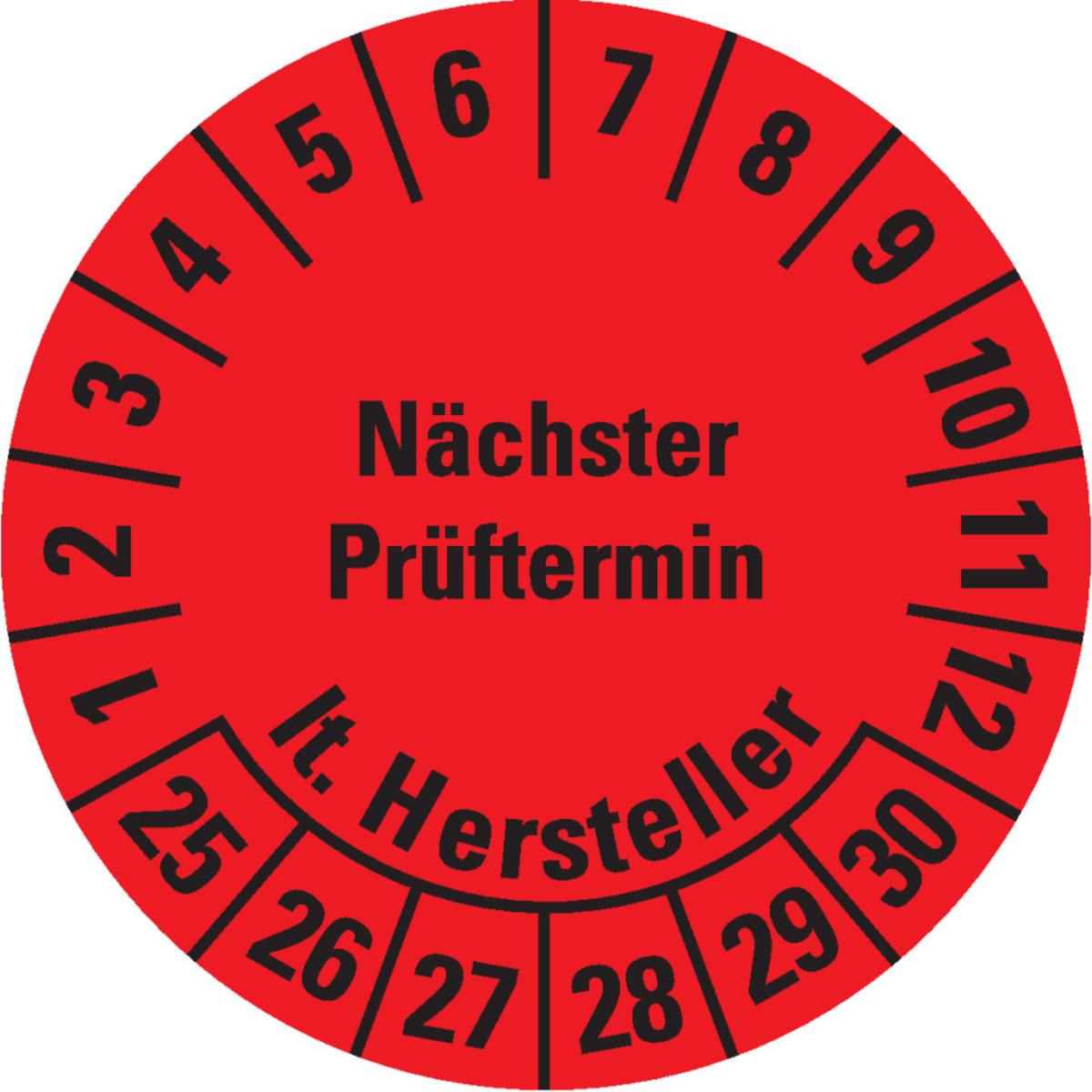 Auswahl: Prüfplakette Nä.Prüft.lt.Hersteller, 25-30, rot, Dokumentenfolie, Ø30mm, 18/Bogen