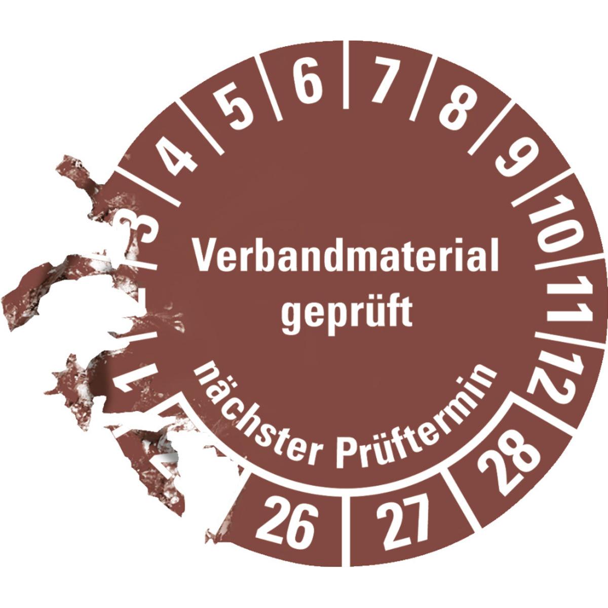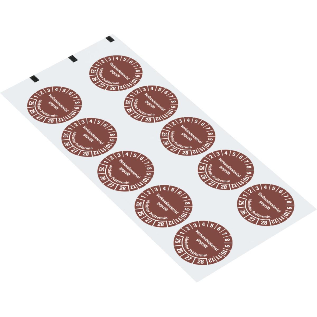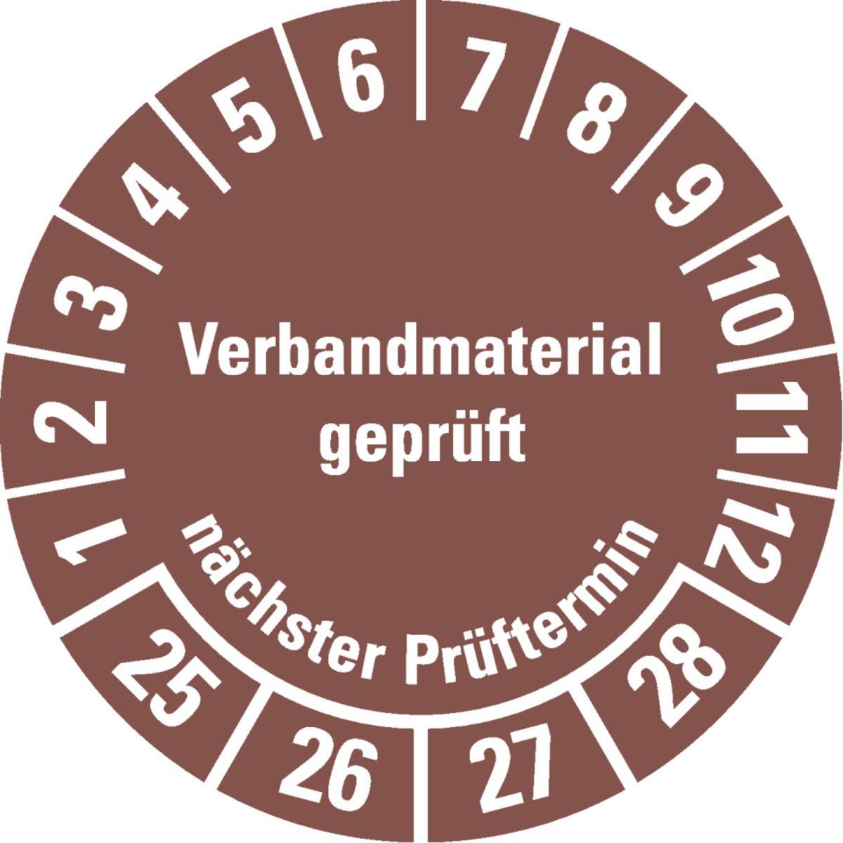 Auswahl: Prüfplakette Verbandmaterial geprüft, NP 25-28, braun, Dokufolie, Ø 35mm, 10/Bogen