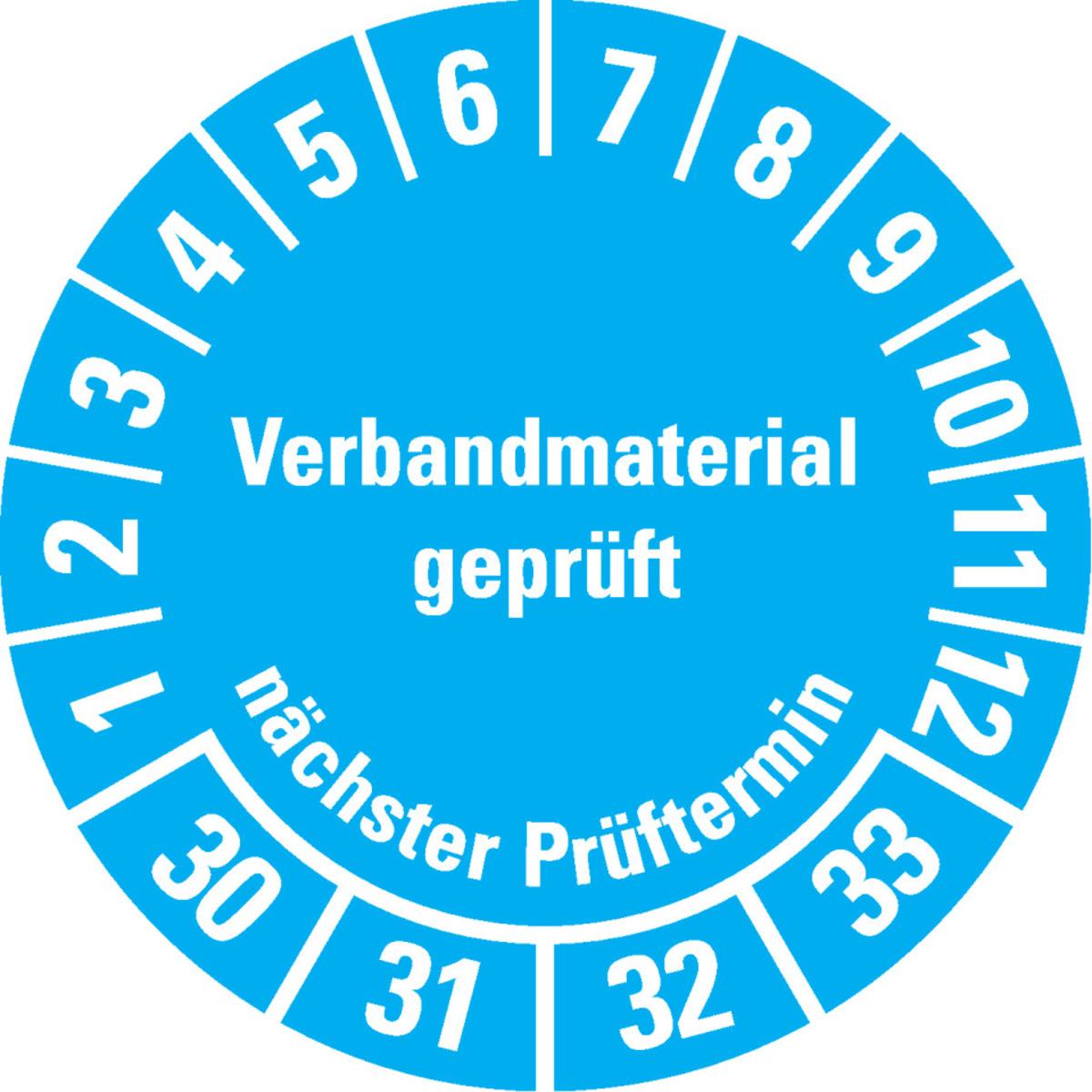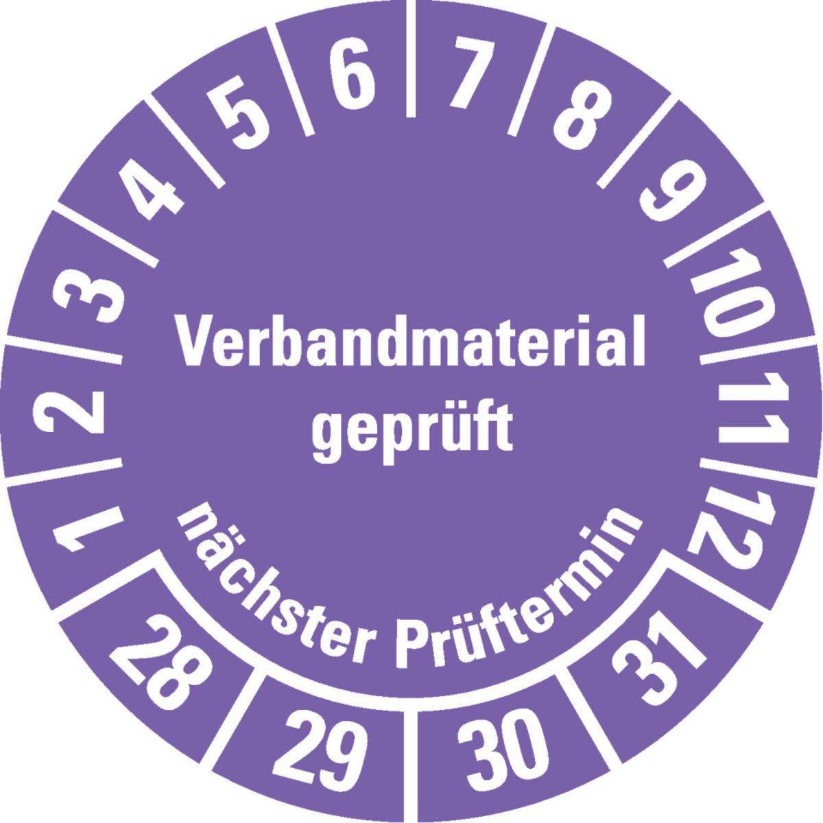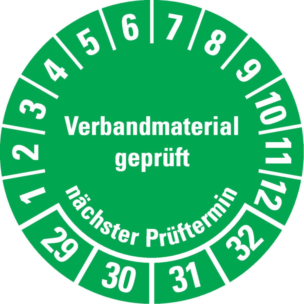 Mehrjahresprüfplakette "Verbandmaterial geprüft" zur Einhaltung von Prüffristen und Erleichterung der Terminkontrolle.