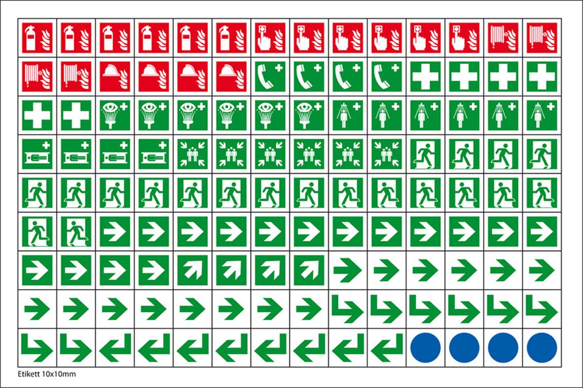 Sammelbogen mit selbstklebenden Minisymbolen bzw. Piktogramme zum Erstellen von Flucht- und Rettungsplänen.