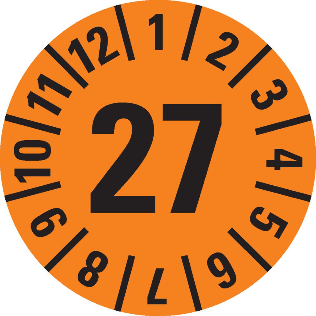 Auswahl: Prüfplakette 27, orange, Cellulose-Folie, selbstklebend, Ø 30mm, 18/Bogen