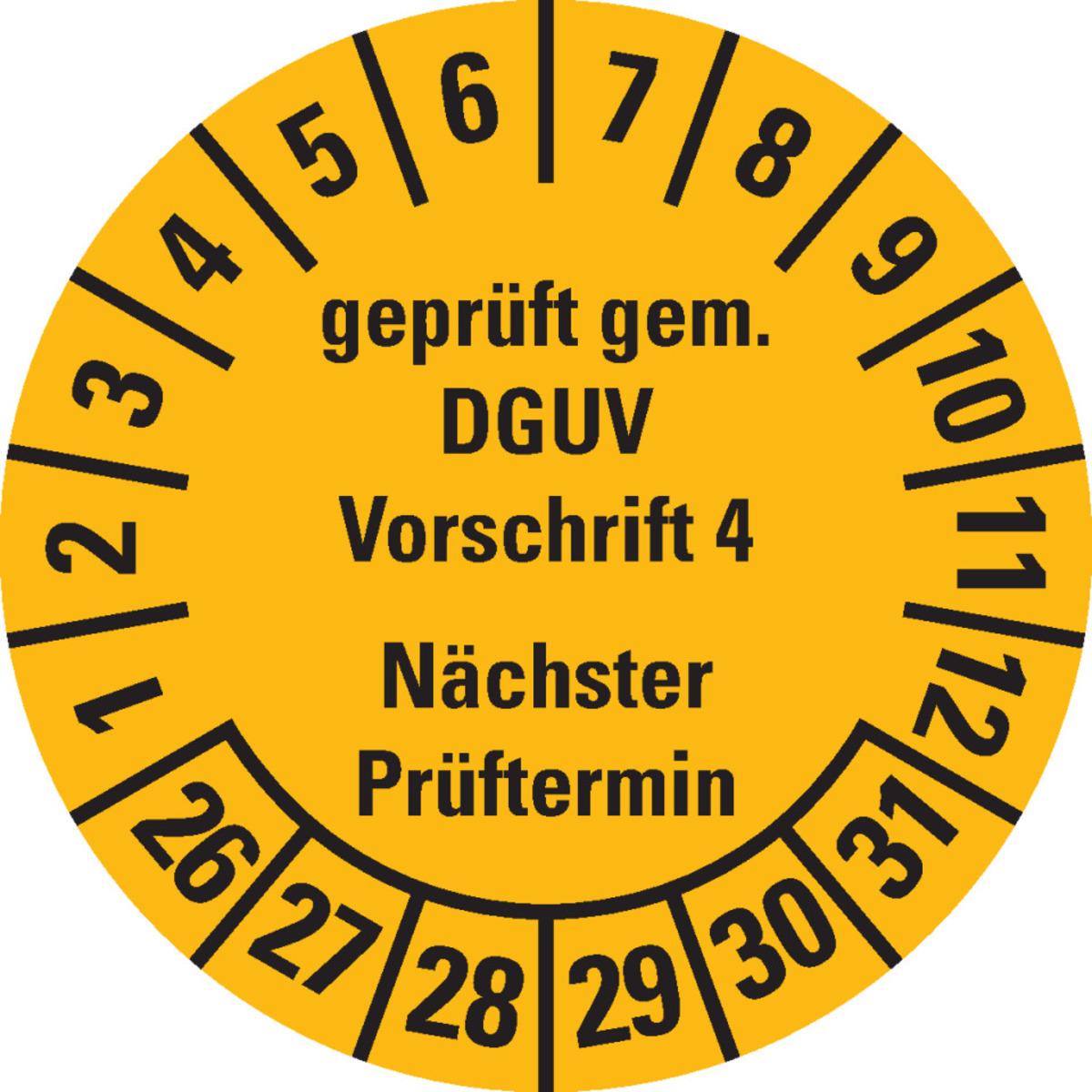 Auswahl: Prüfplakette Geprüft gem.DGUV Vorschrift 4, 26-31, gelb, Dokufolie, Ø30mm, 18/BOG