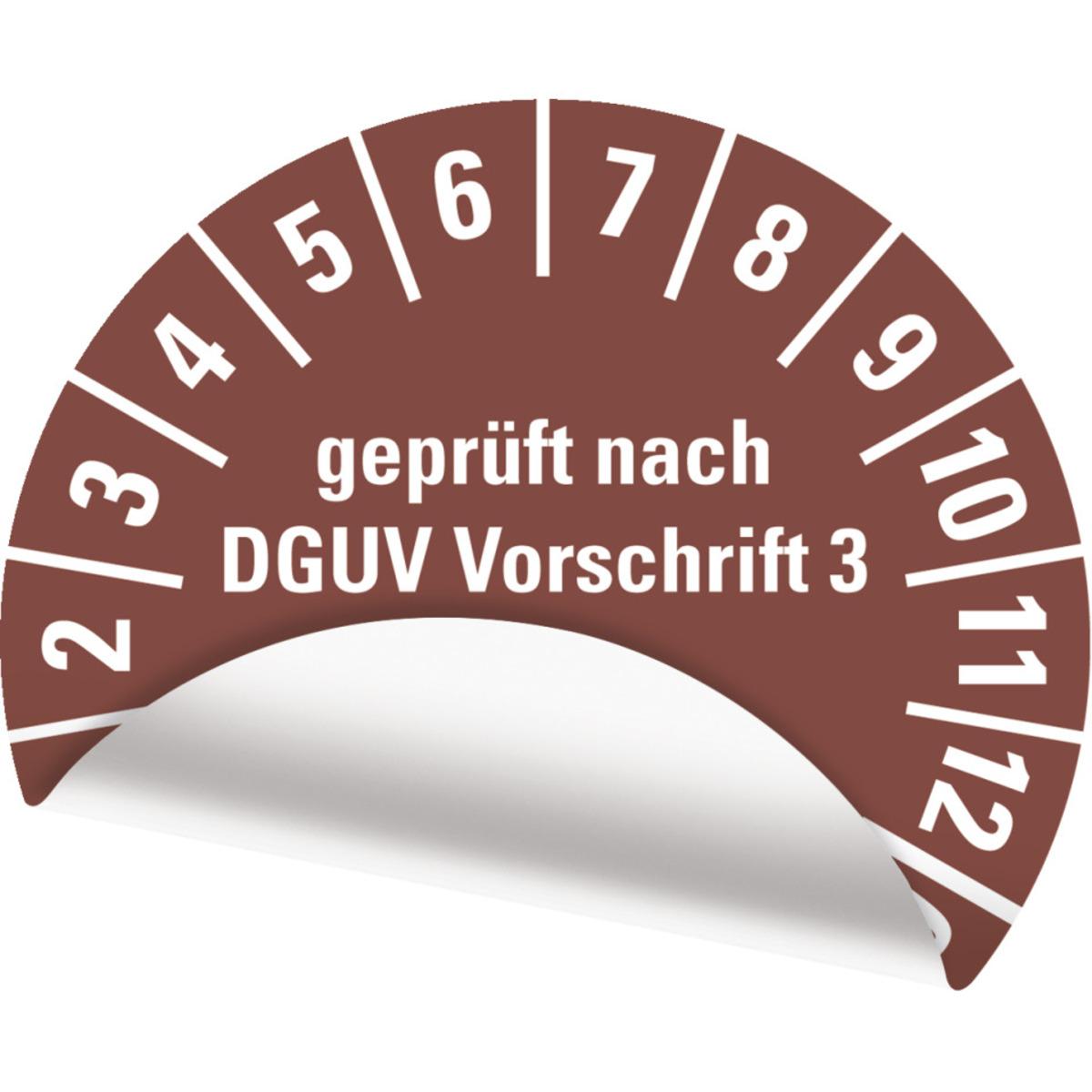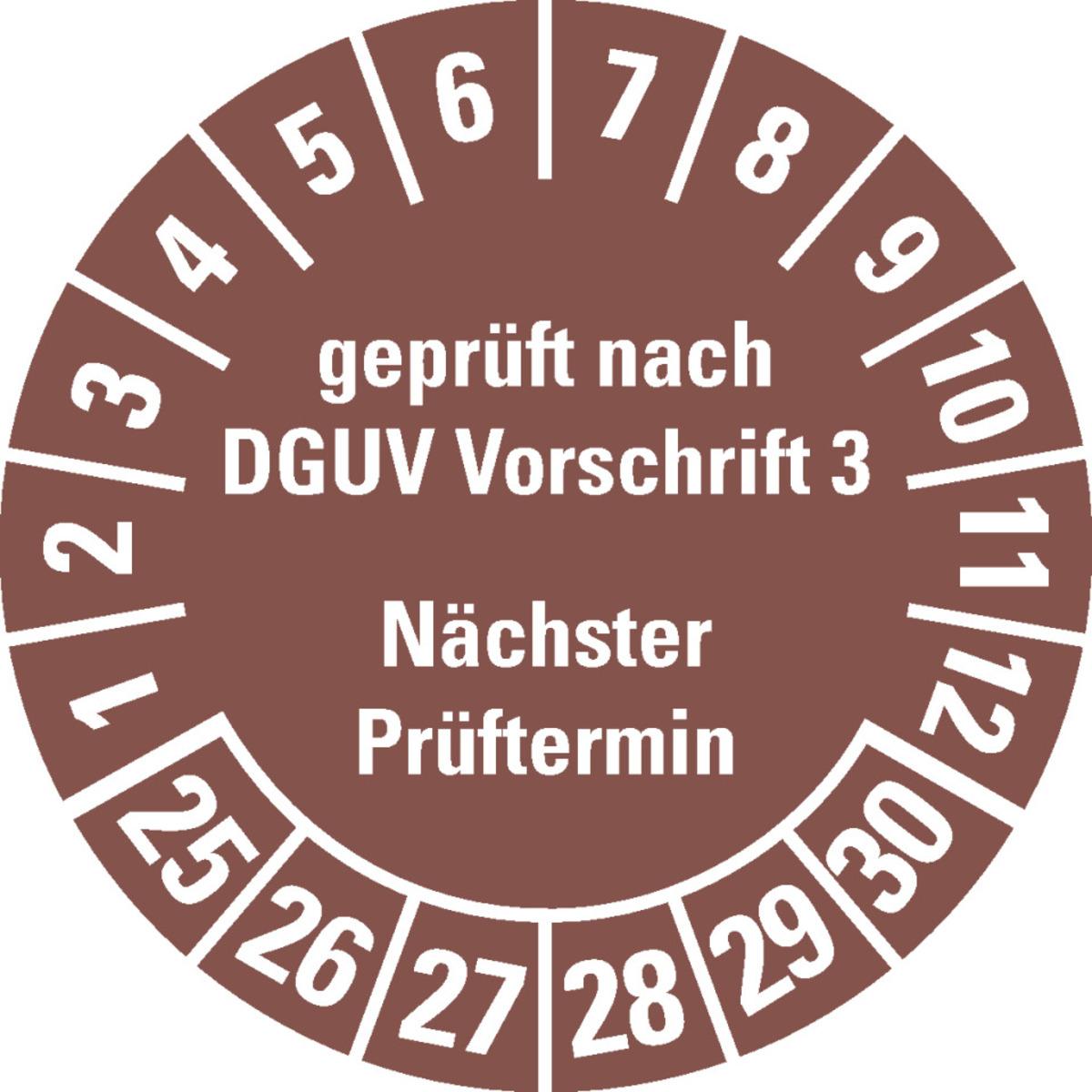 Auswahl: Prüfpl.gepr.DGUV Vor.3 Nä.Prüft., 25-30, braun, Cellulose-Folie, Ø 30mm, 18/Bogen