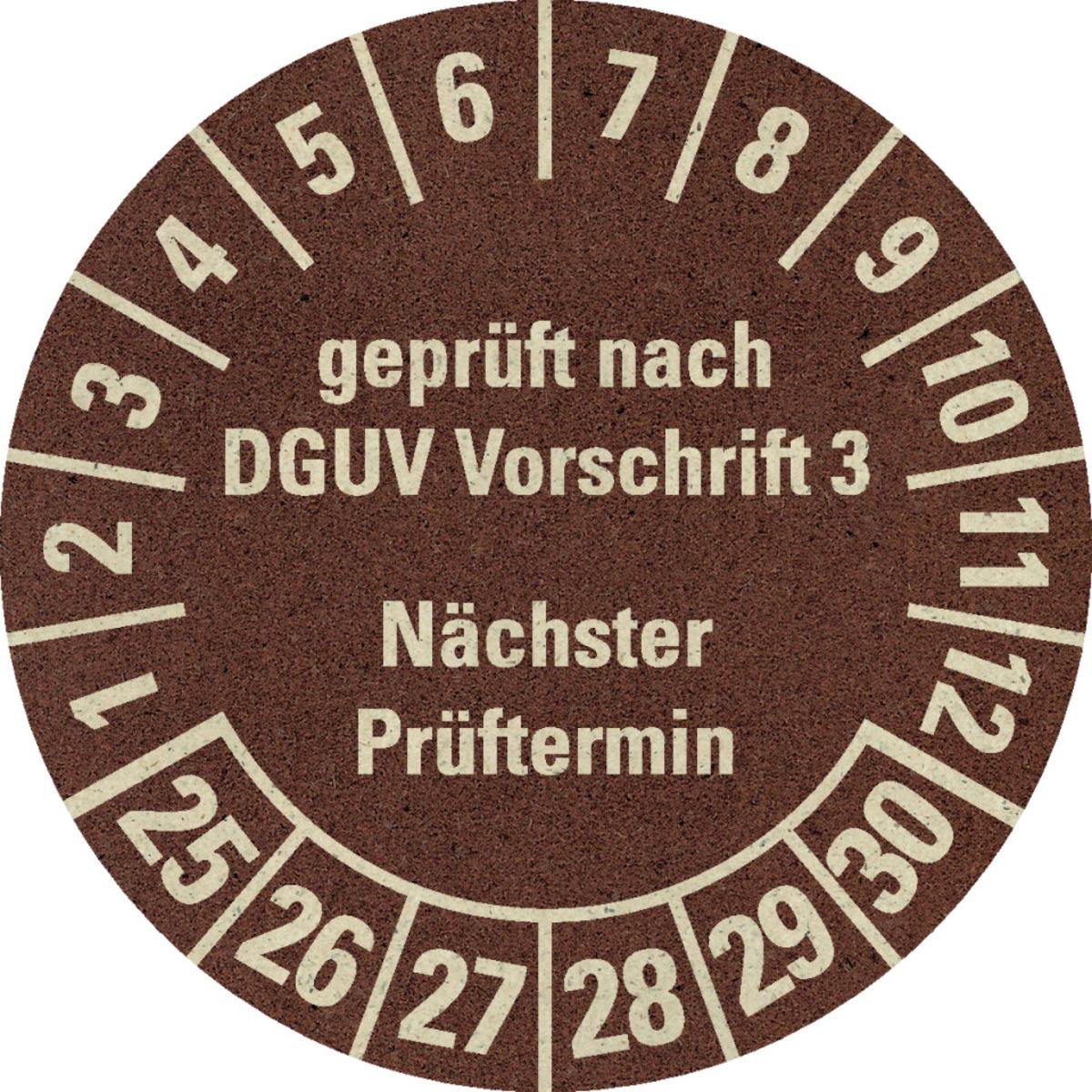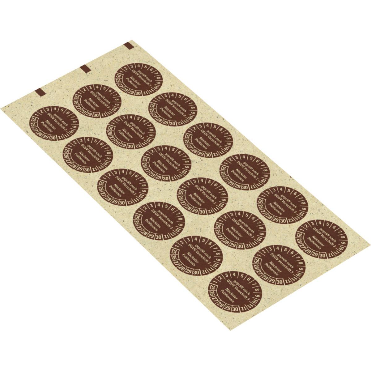 Auswahl: Prüfplakette gepr.DGUV V3 NP, 25-30, braun, Primärfaser-Graspapier, Ø 30mm, 18/Bogen