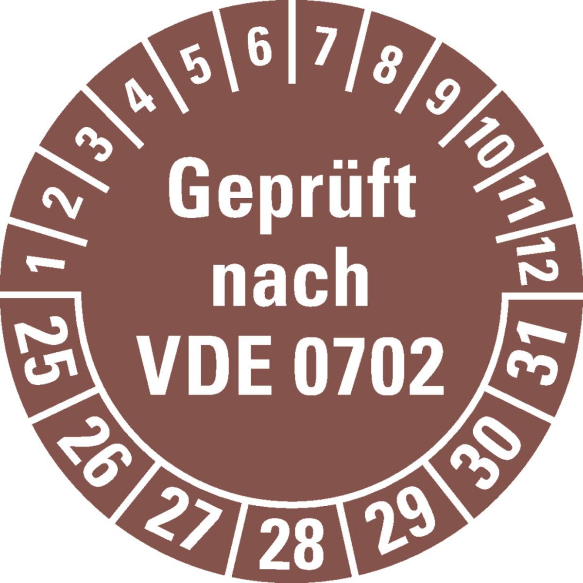 Auswahl: Prüfplakette Geprüft nach VDE 0702 25-31, braun, Dokumentenfolie, Ø30mm, 18/Bogen