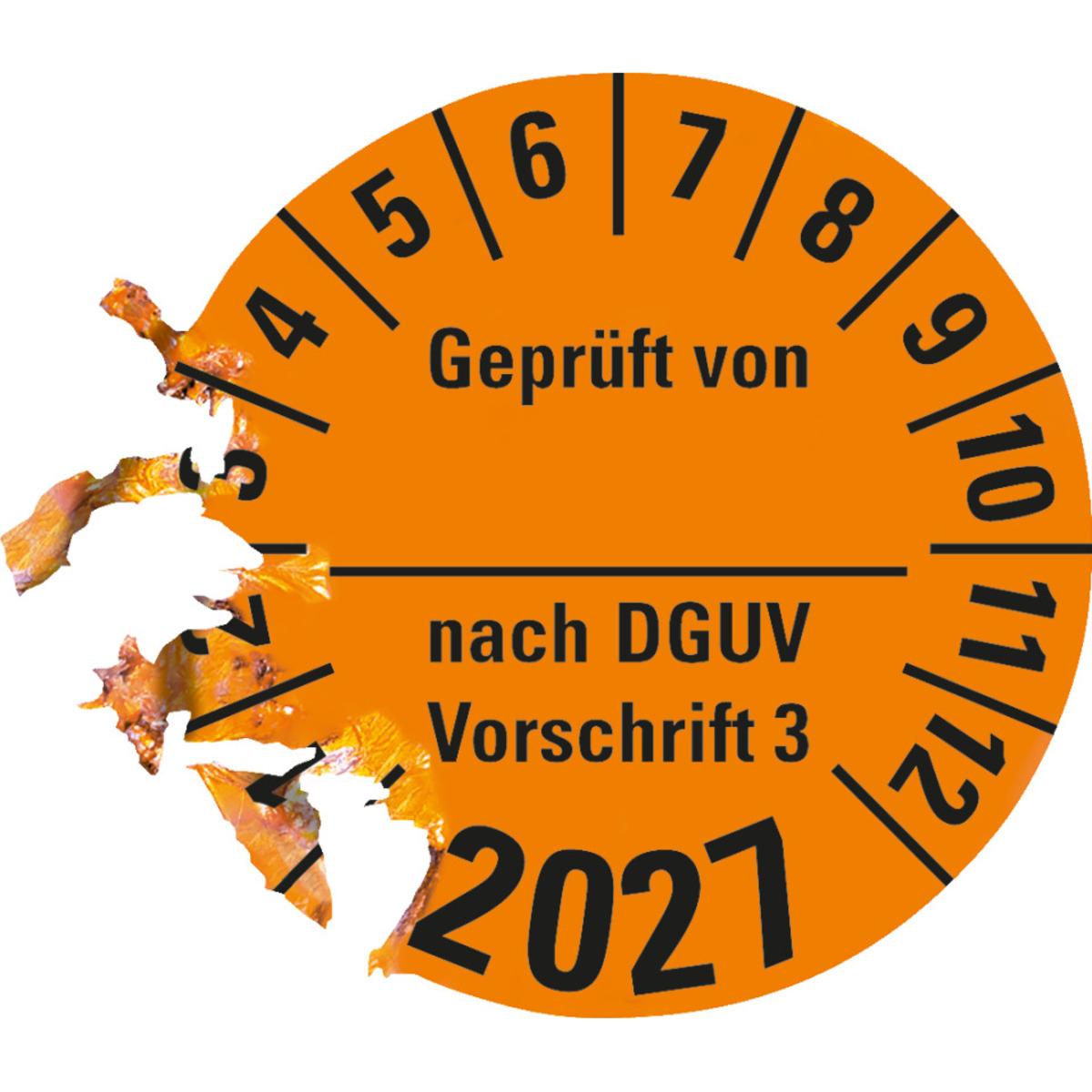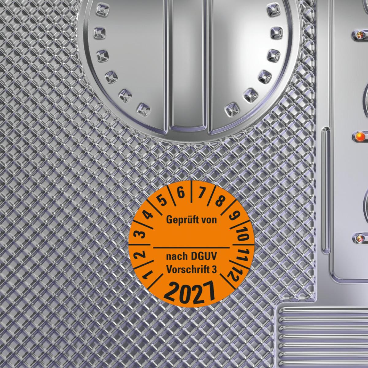 Auswahl: Prüfplakette Geprüft von nach DGUV 3, 2027, orange, Dokufolie, Ø 30mm, 108/Heft