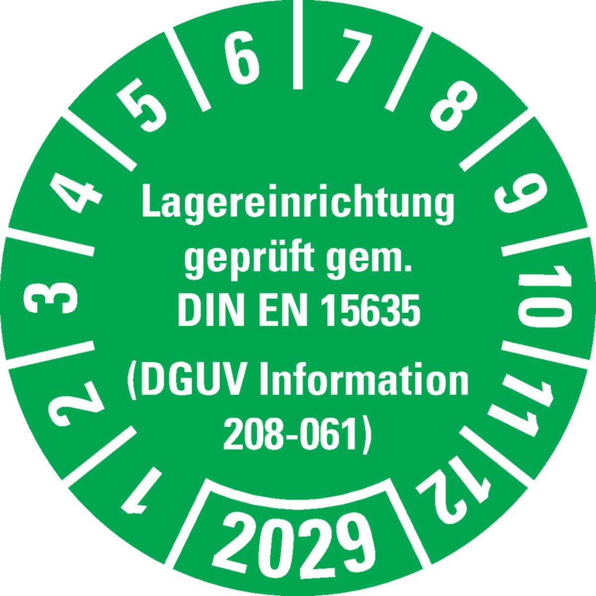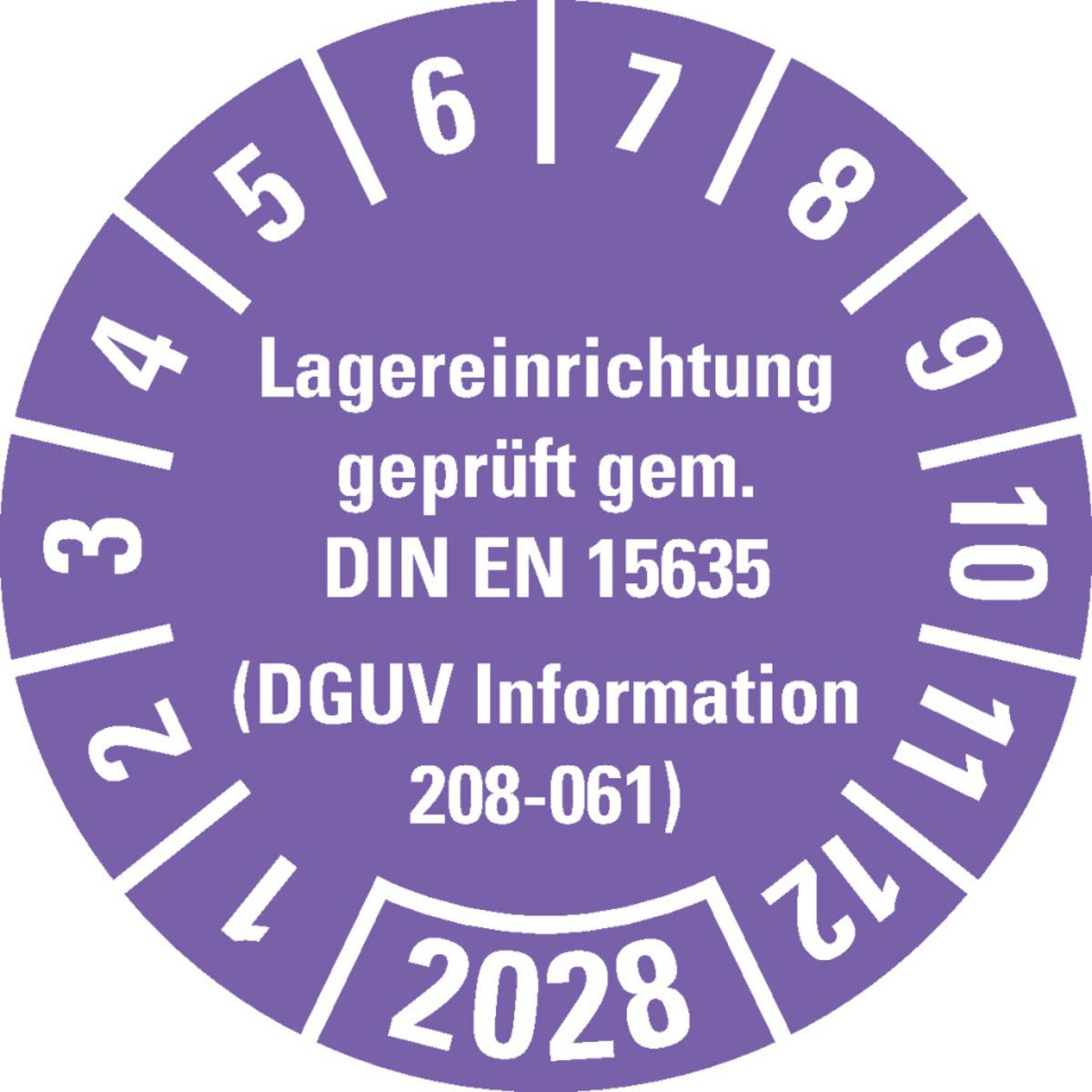 KSIGN Prüfplakette Lagereinrichtung geprüft gem. DIN EN 15635 (DGUV Information 208-061) Ø 30 mm Dokumentenfolie Bogen