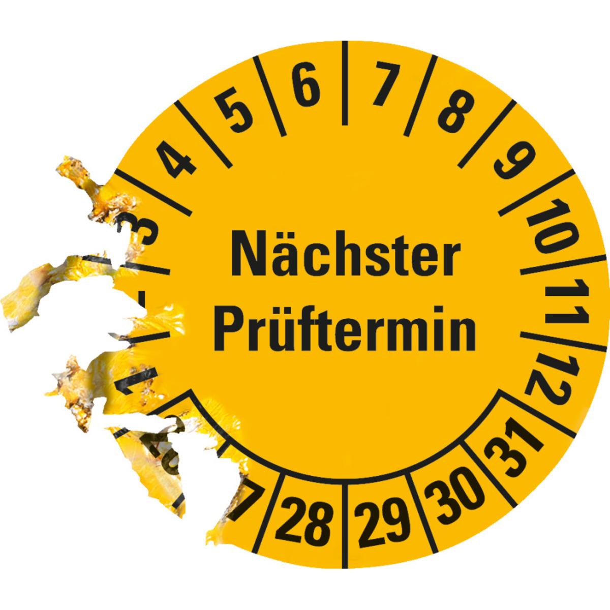 Auswahl: Prüfplakette Nächster Prüftermin, 26-31, gelb, Dokufolie, Ø 30mm, 500/Rolle