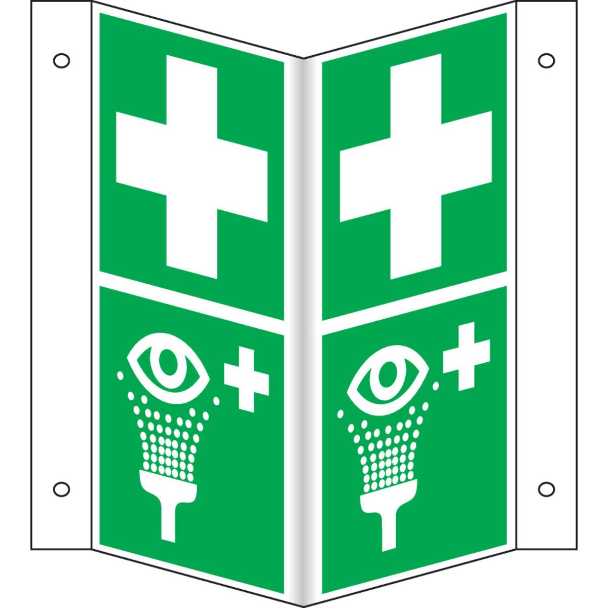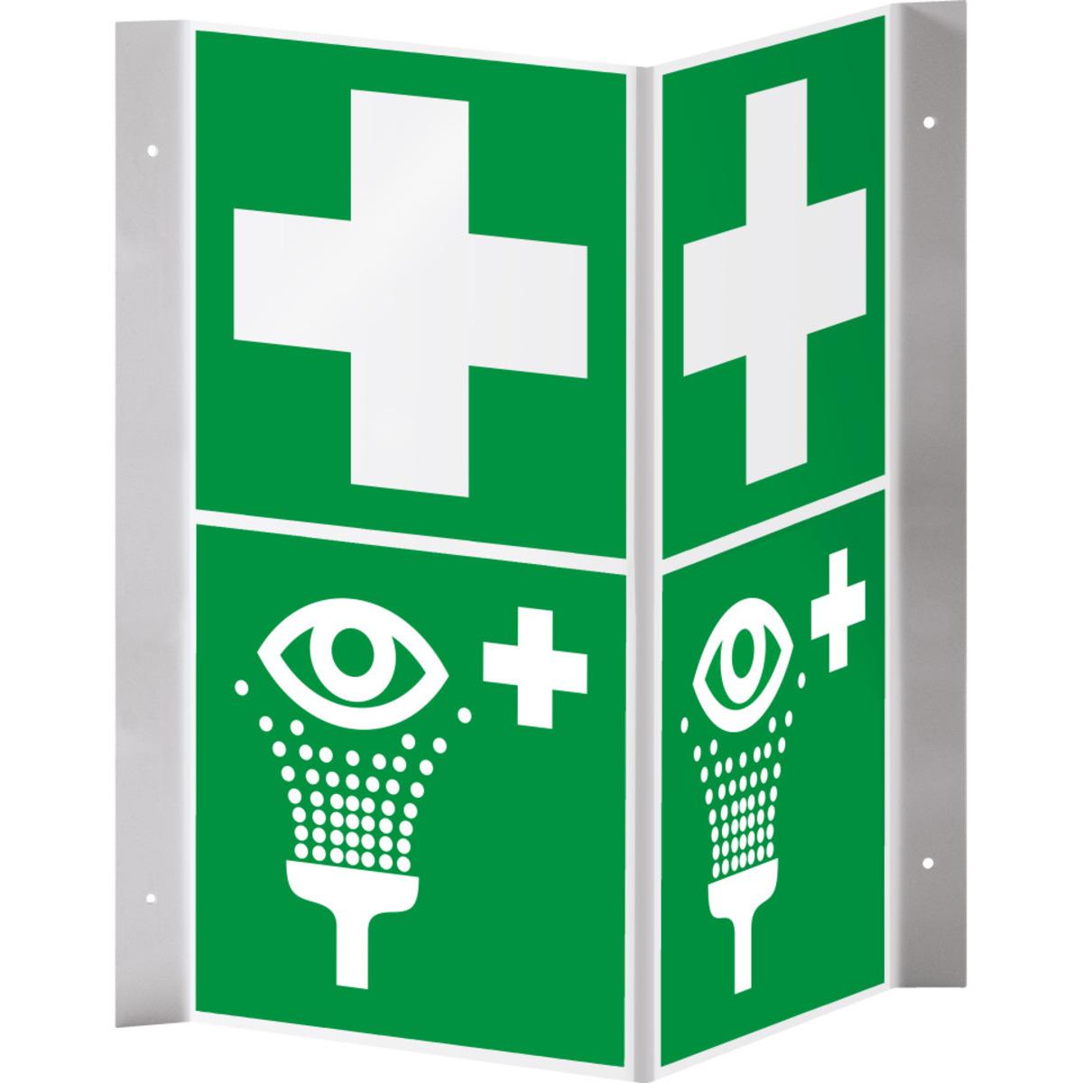 Durch das Nasenschild mit den Piktogrammen "Erste Hilfe" und "Augenspülstation" schützen Sie Leben und Gesundheit Ihrer Mitarbeiter und/oder Besucher, indem Sie Notfalleinrichtungen eindeutig und aus jeder Richtung erkennbar kennzeichnen.