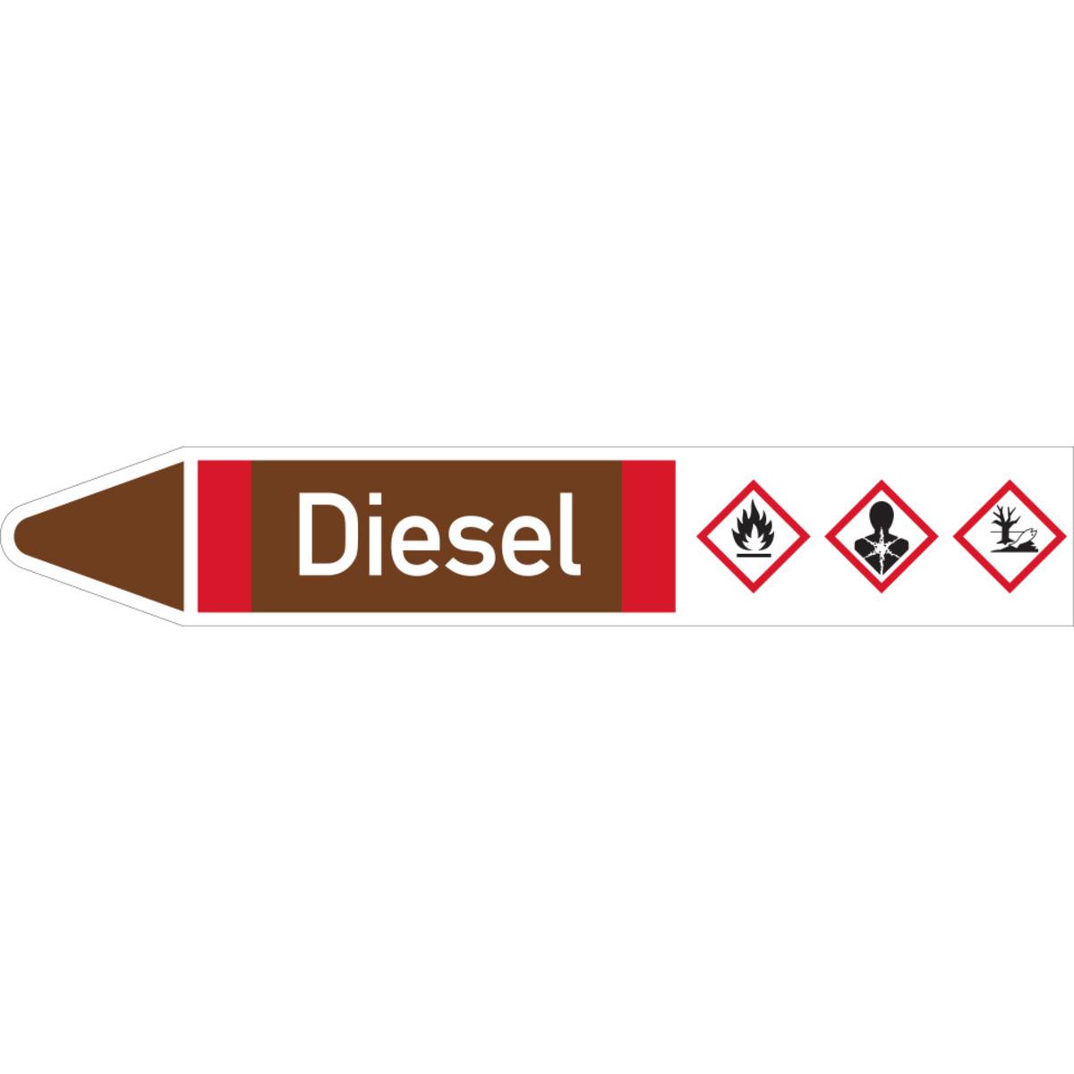 Auswahl: RKZ-Etikett Diesel, links, DIN, braun/weiß/rot, für Ø 25-40mm, 154x26mm, 5/Bogen