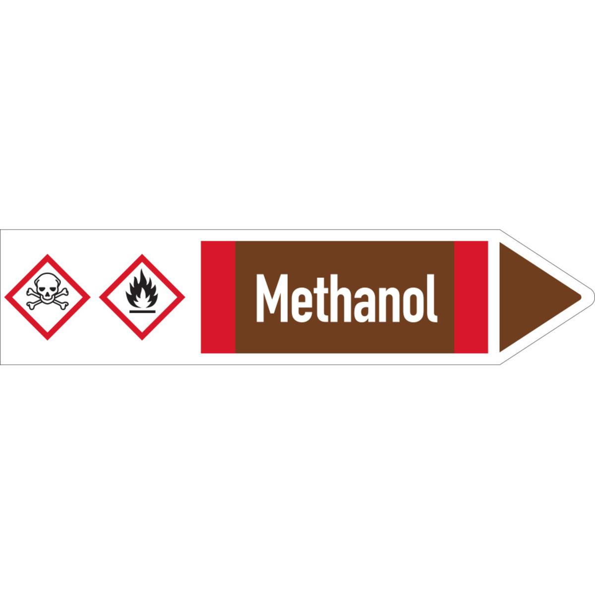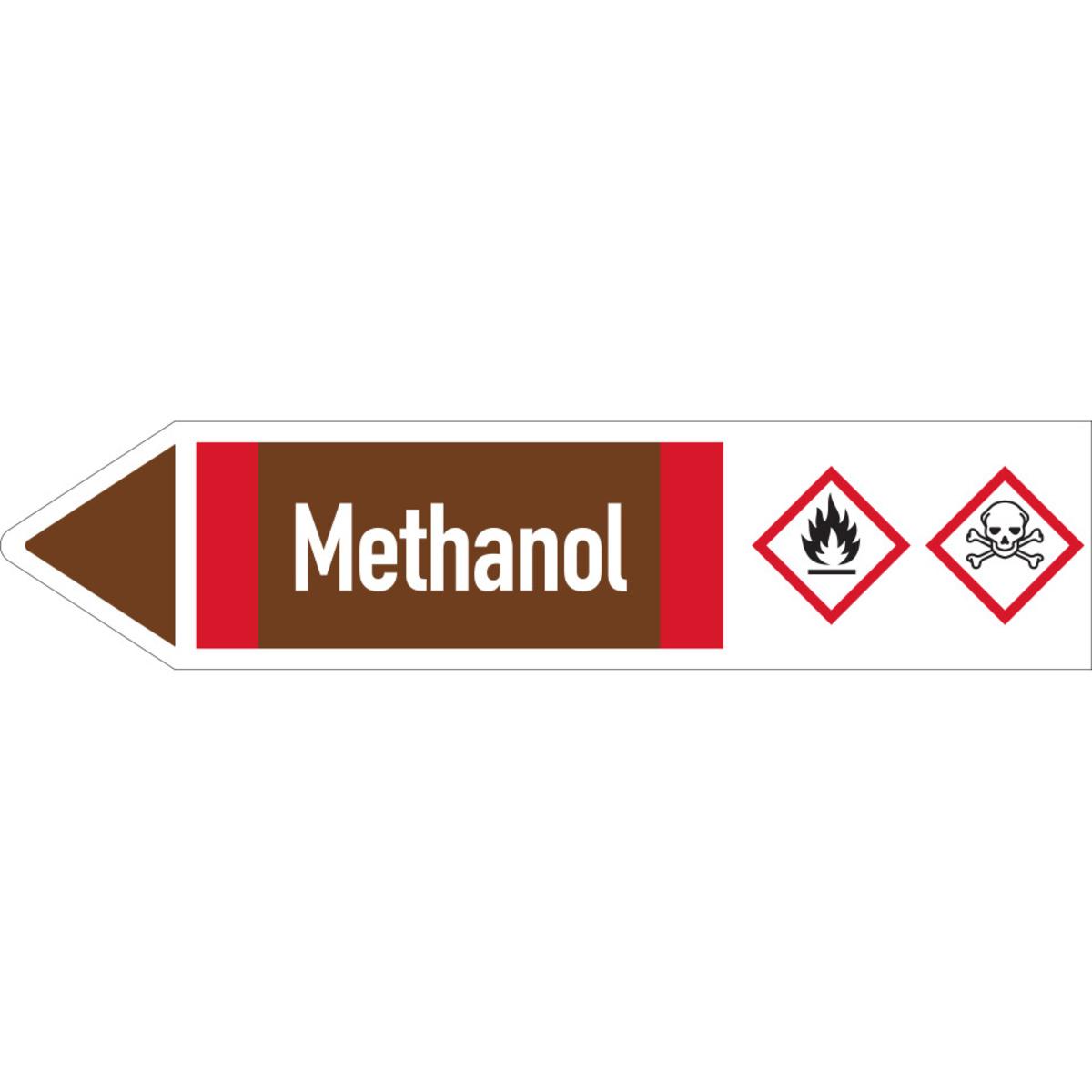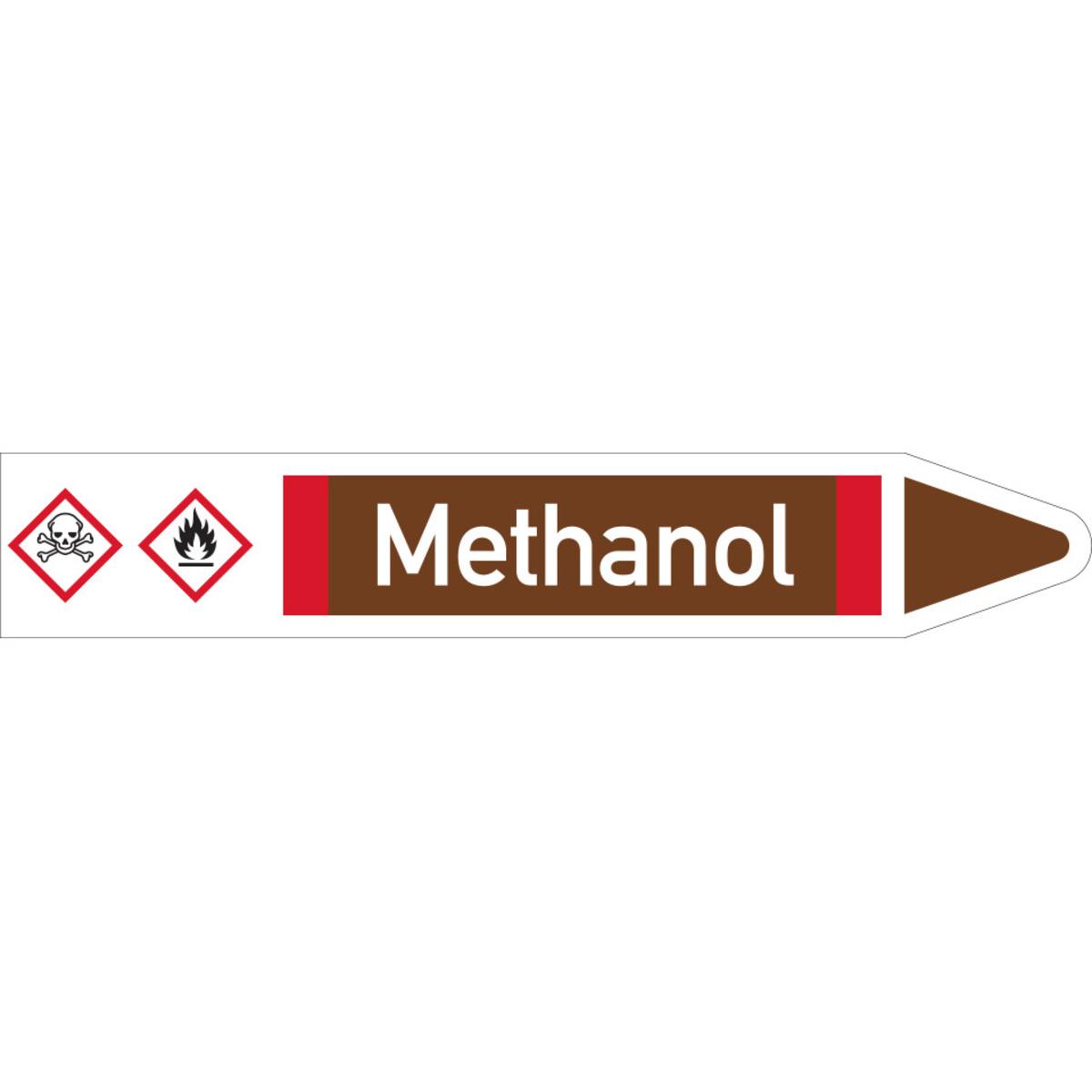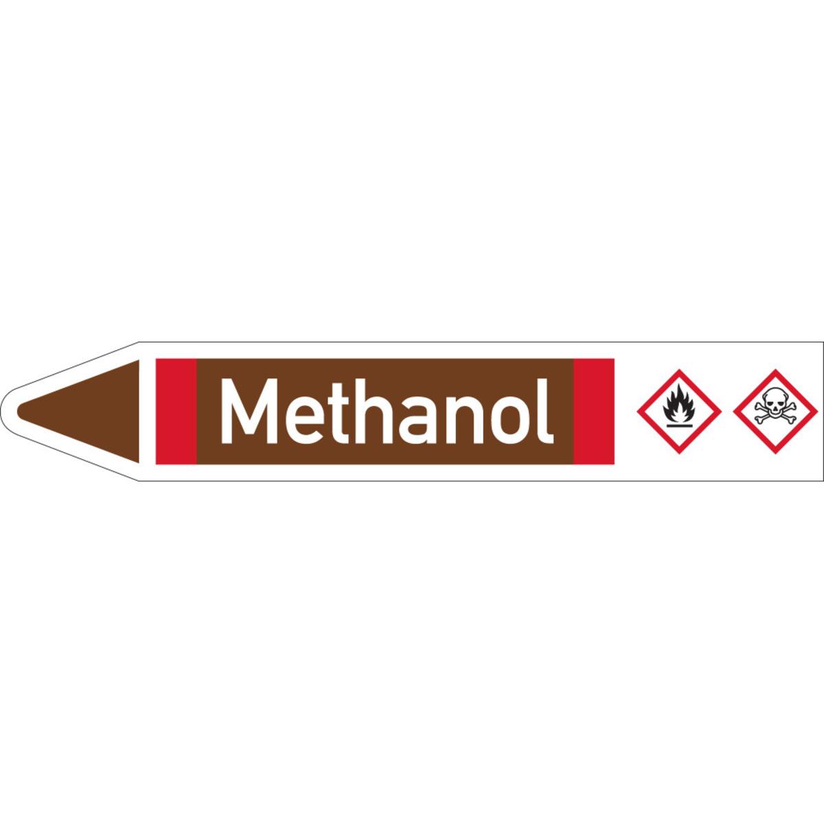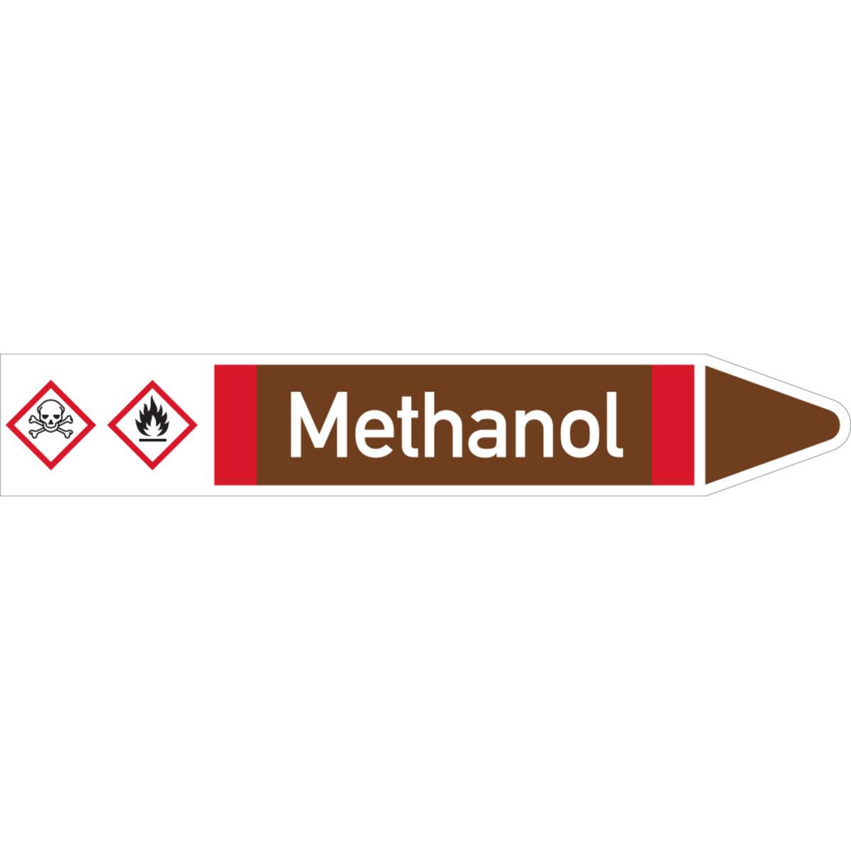 Auswahl: RKZ-Etikett Methanol, links, DIN, braun/weiß/rot, für Ø 25-40mm, 154x26mm, 5/Bogen