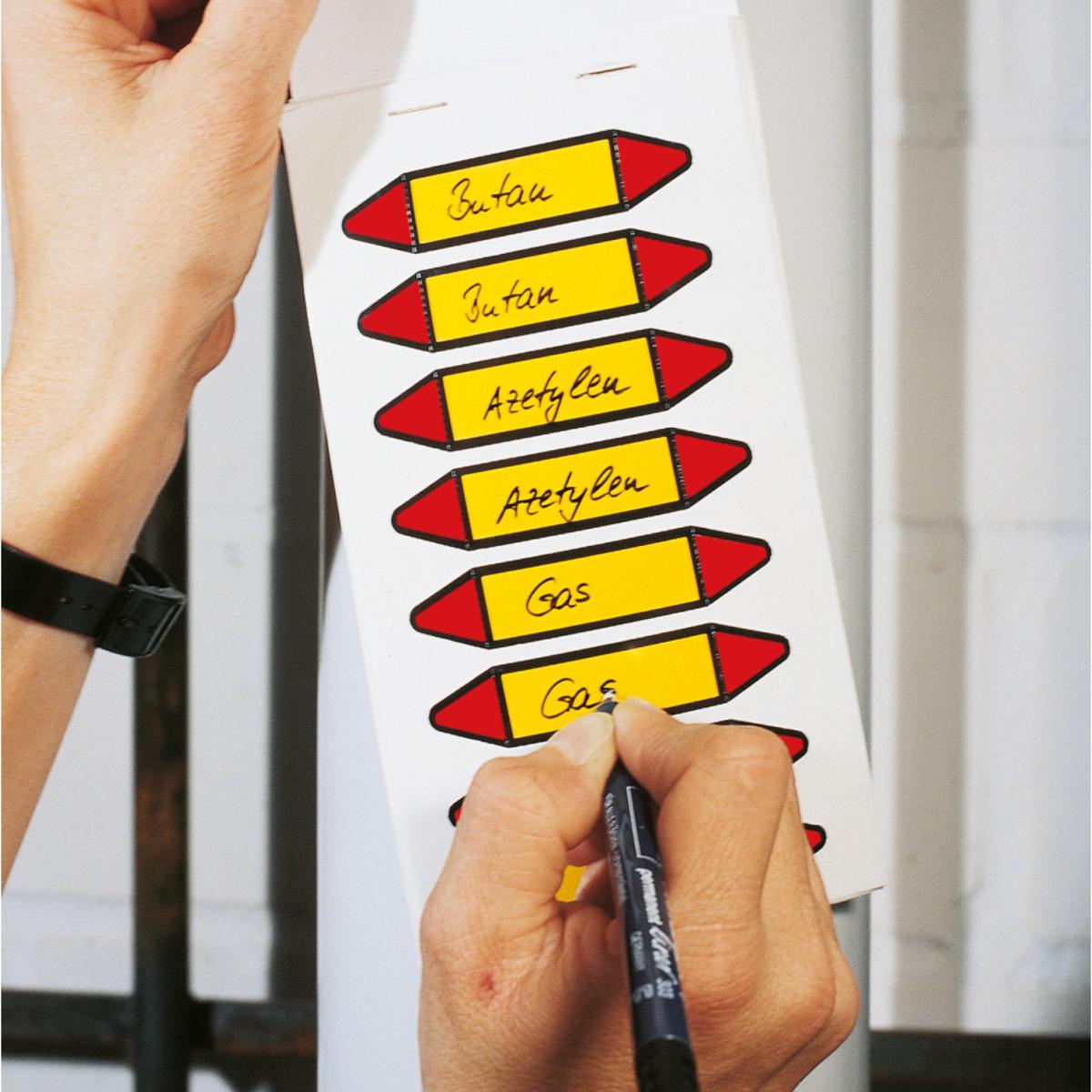 Rohrleitungs-Einzeletikett zum Selbstbeschriften und nachträglichen Laminieren. Perforationslinie zum Abtrennen der nicht benötigten Pfeilspitze, die individuelle Beschriftung wird durch Schutzlaminat dauerhaft geschützt.