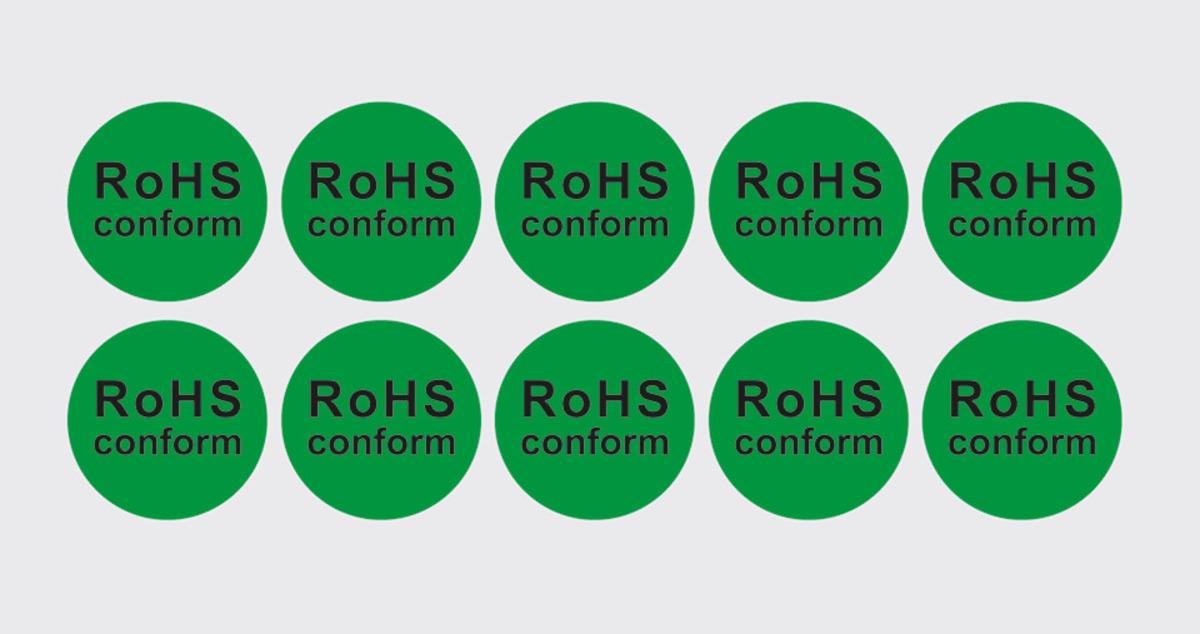 ROHS-Kennzeichen, welche auf nicht enthaltene umweltgefährdene Substanzen innerhalb des beklebten elektronischen Gerätes hinweisen.