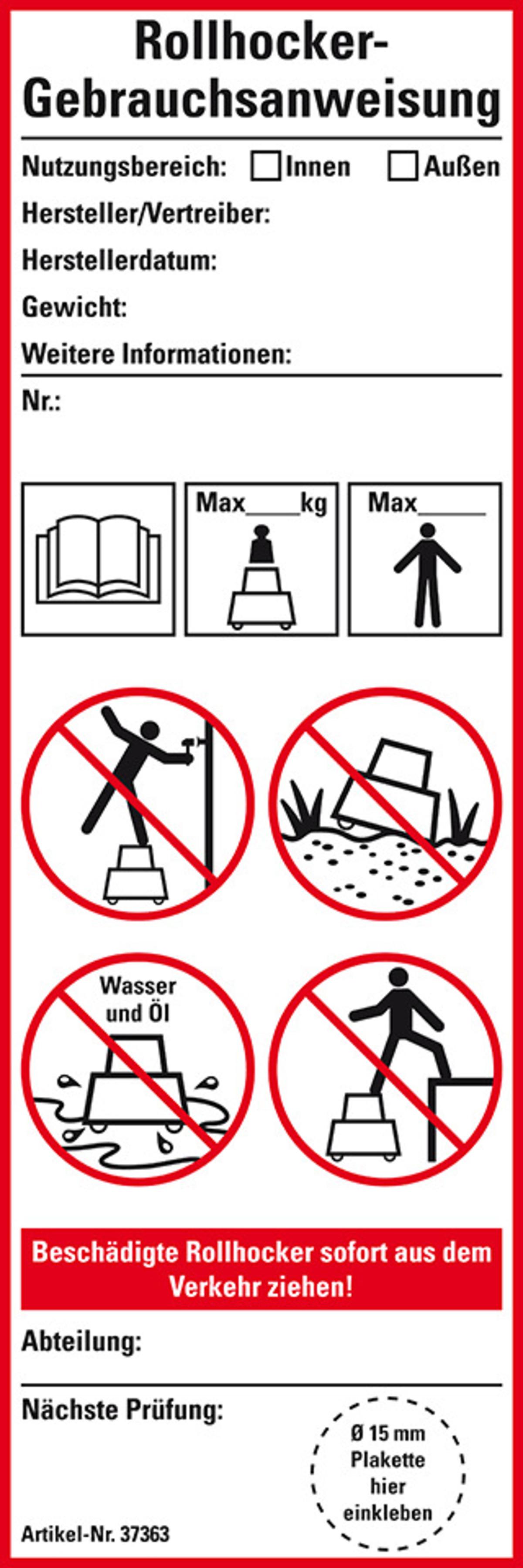 KSIGN Rollhocker-Gebrauchsanweisung 50 mm 150 mm Ø Prüfplakette max: 15 mm
