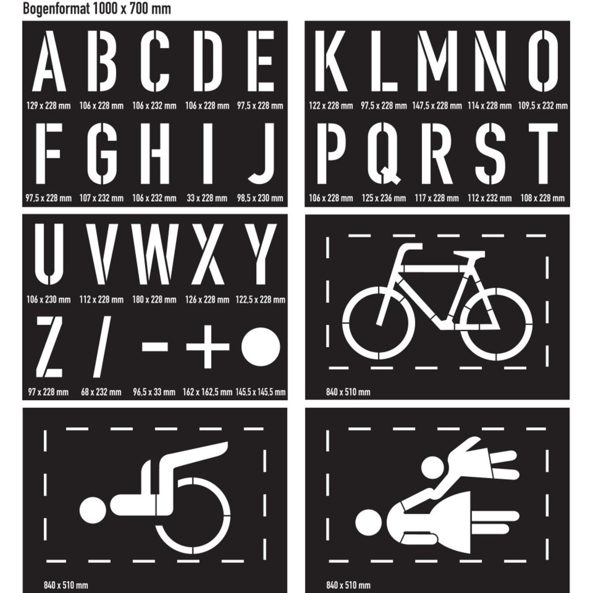 Schablonensatz Nr. 3 zum Aufsprühen von Buchstaben mit 230 mm Schrifthöhe, Piktogrammen und Symbolen zur Markierung auf dem Boden, für deutliche und randscharfe Ergebnisse, mehrfach benutzbar, mit allen Sprüh- und Bodenfarben verwendbar